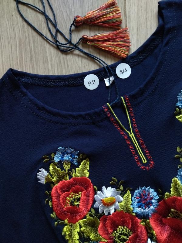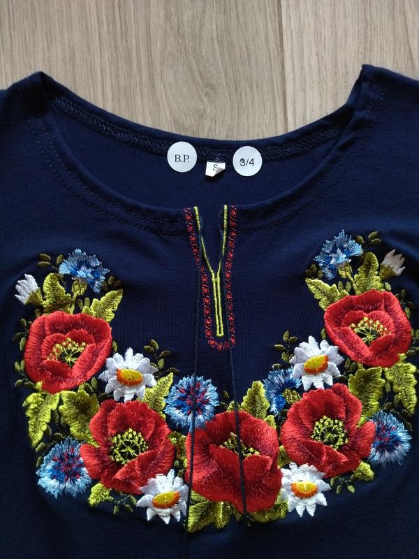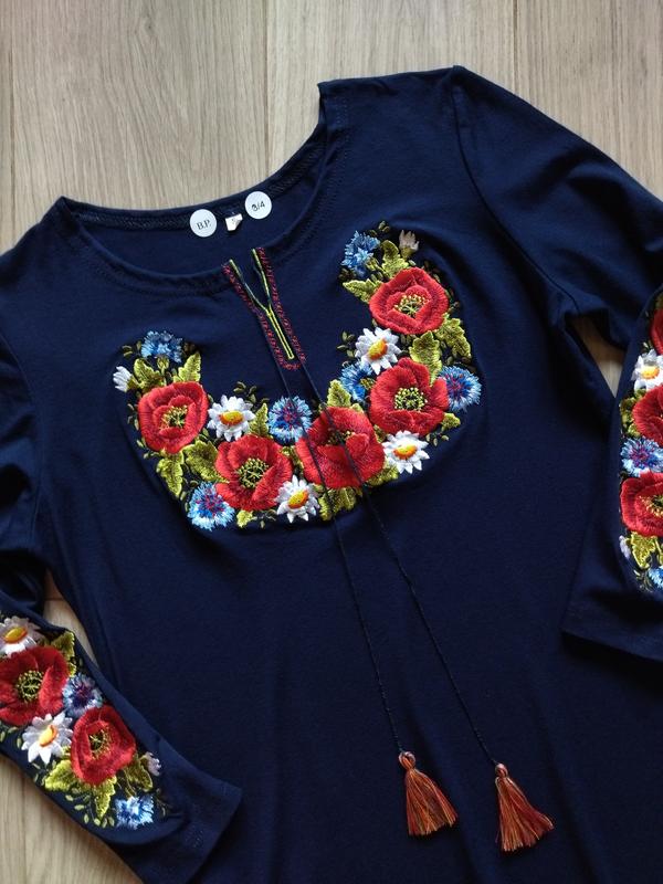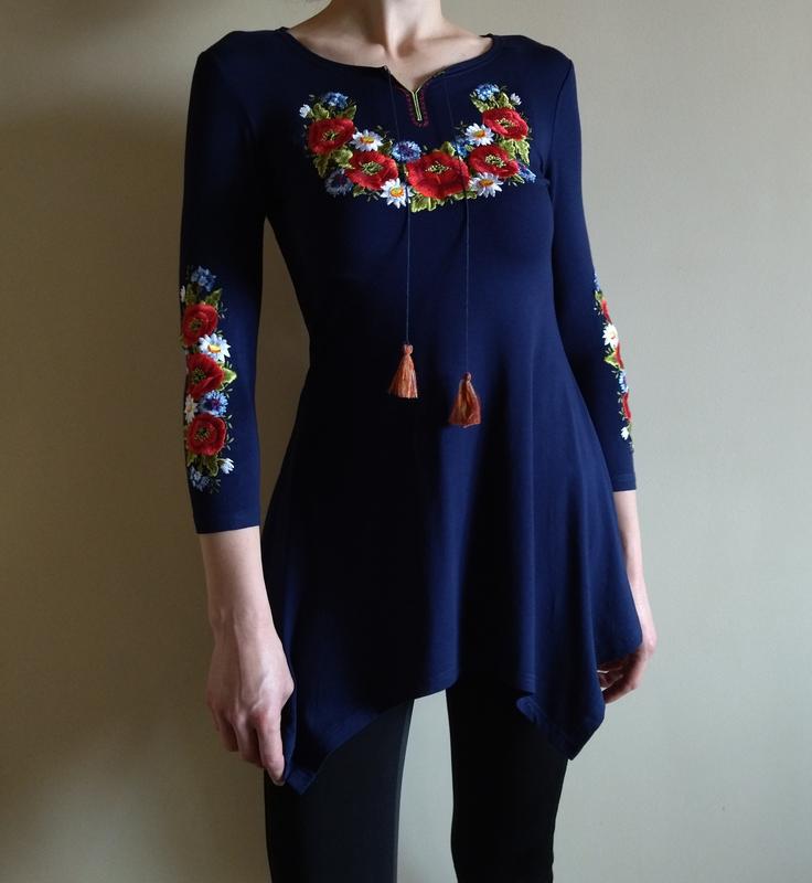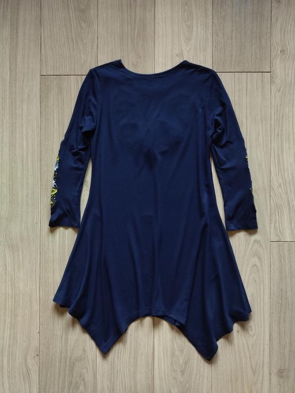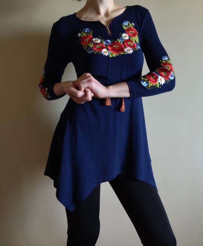Трикотажні туніки, нові, без етикеток, асиметричного крою, рукав 3/4, колір темно-синій з яскравою вишивкою. Тканина не щільна, тягнеться, склад на жаль, не вказано. Розмір на бірці М, може маломірити.