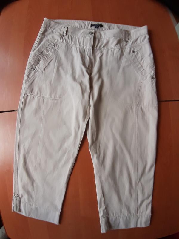 Стан ідеальний,62% поліестер,398% бавовна. Дві фронтальні і дві задні кишені. Розмір за етикеткою-44 евро. Довжина-82см, ширина по талії-46см, по лінії стегон-57см, посадка спереду-28см, посадка ззаду-42см, ширина калоші вгорі-33см, внизу-21см.