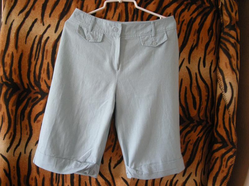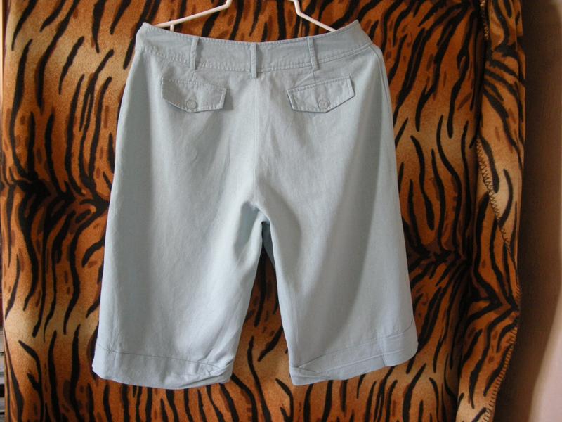 Класні шорти світло-блакитного кольору,фірмові"Hamilton",натуральні-55%льон,45%віскоза,широкий пояс,попереду і ззаду по дві кишеньки-обманчика з гудзиками,низ штанин-широкий манжет,з внутрішньої сторони присобран в складки,об'єм талії-80см.,довжина-52см.