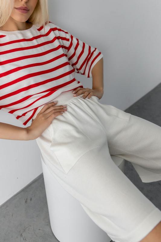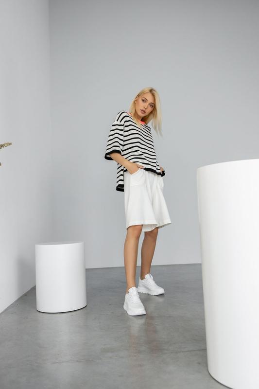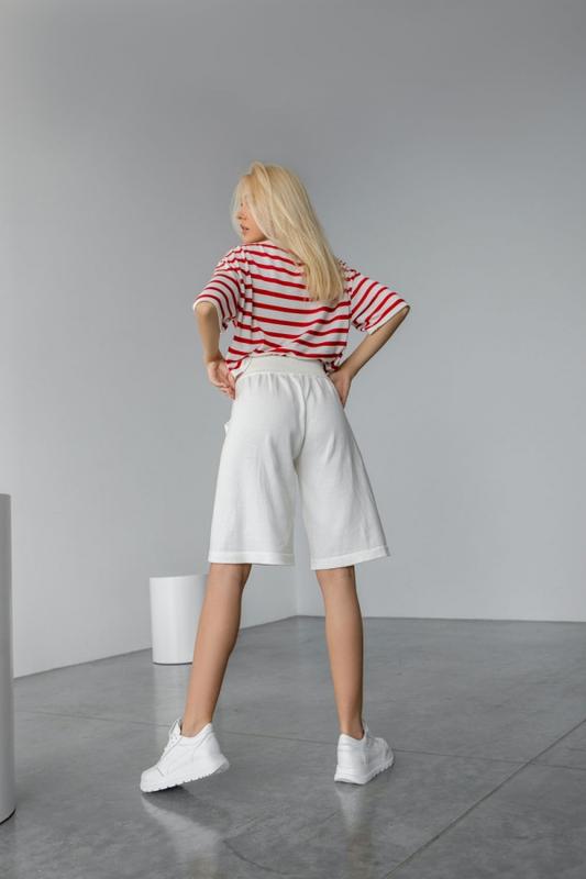 Трикотажні подовжені літні шорти прямого силуету з приємною до тіла натуральної бавовняної пряжі. Талія підкреслена сидить на природному місці високим і еластичним поясом-резинкою. Лаконічність дизайну виражена у відсутності бокового шва і вив'язаних функціональних кишенях. Довжина шортів по бічному шву з поясом 53 см. Ширина штанини 32-36 див. Кольори: білий, чорний, зелений