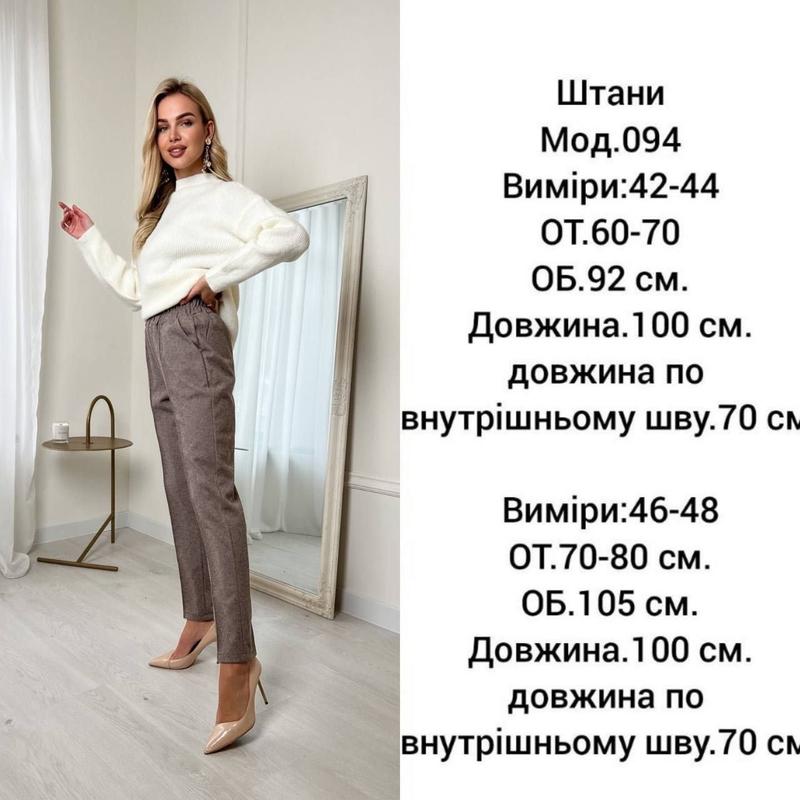 Брюки. Матеріал: кашемір. Доступні розміри: 42-44, 46-48. Заміри на останньому фото. Кольори в наявності: беж, мокко. Ціна 690 грн. Відправка Новою поштою, Укрпоштою.