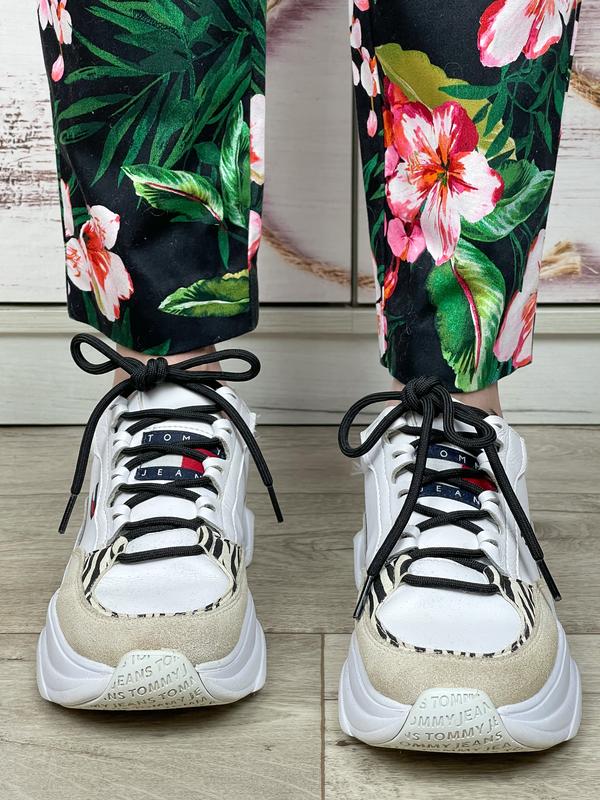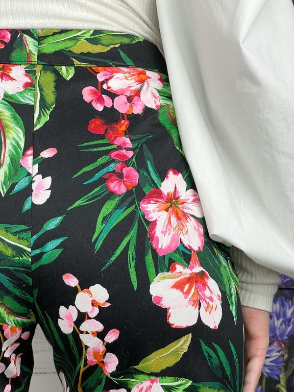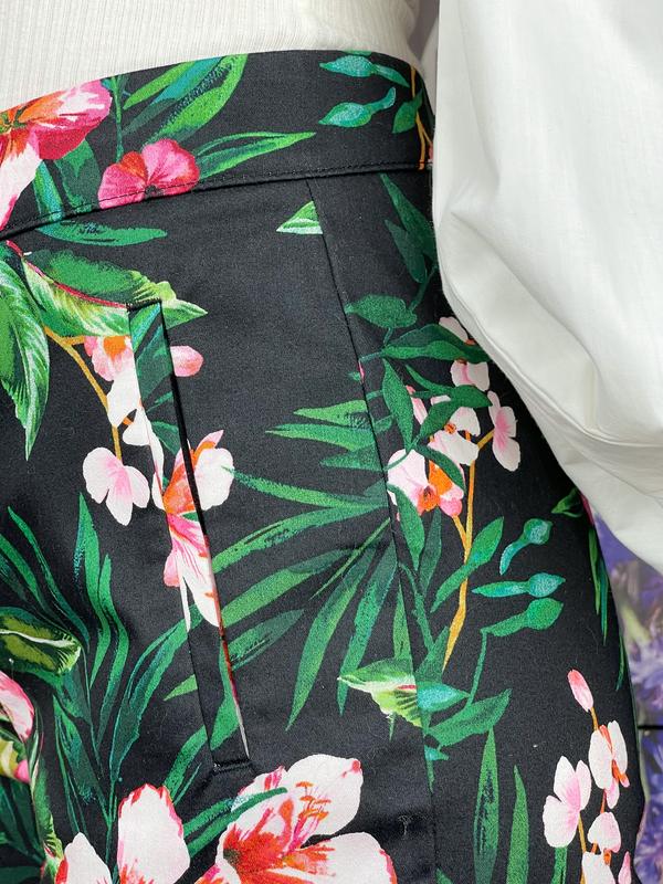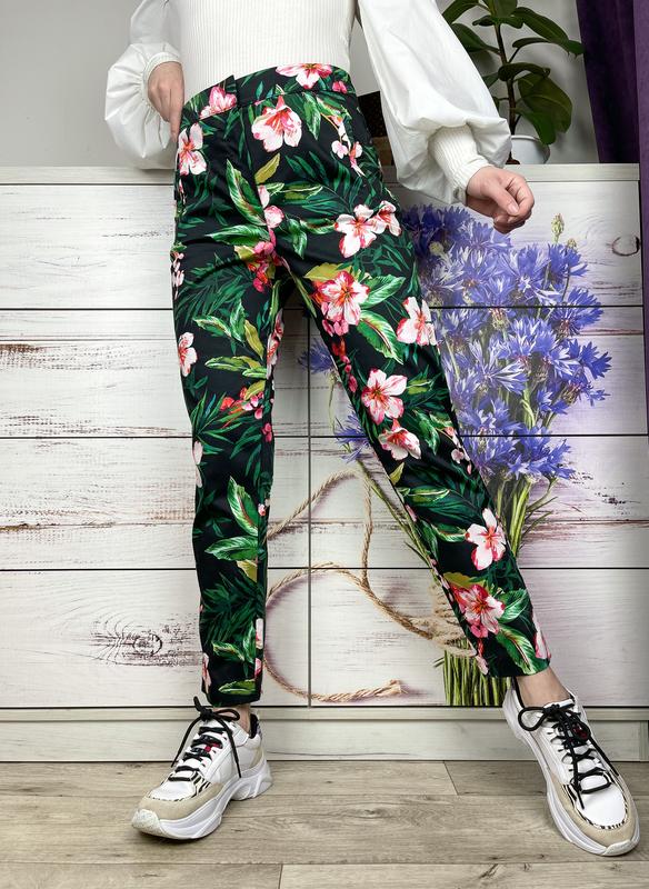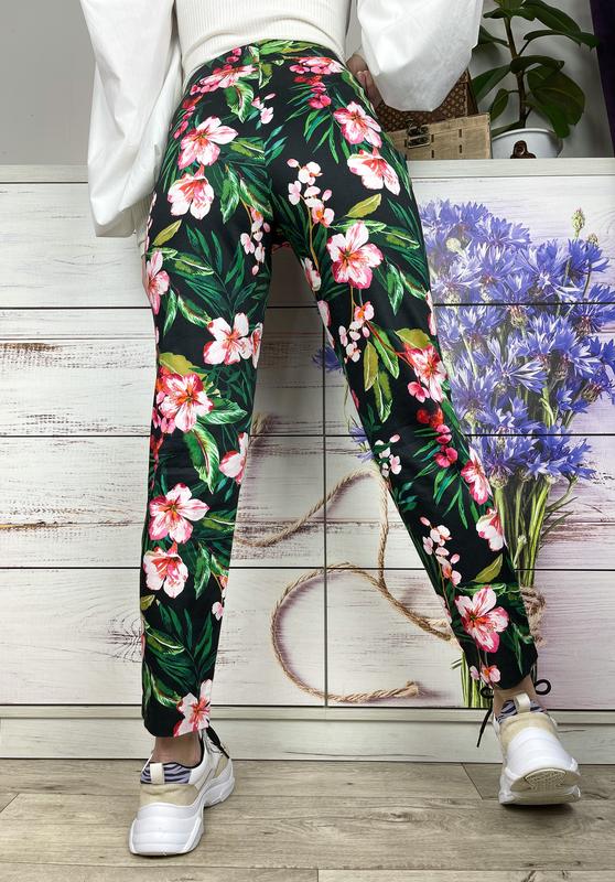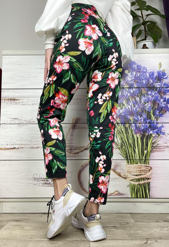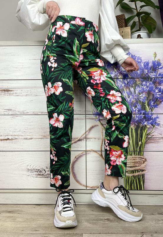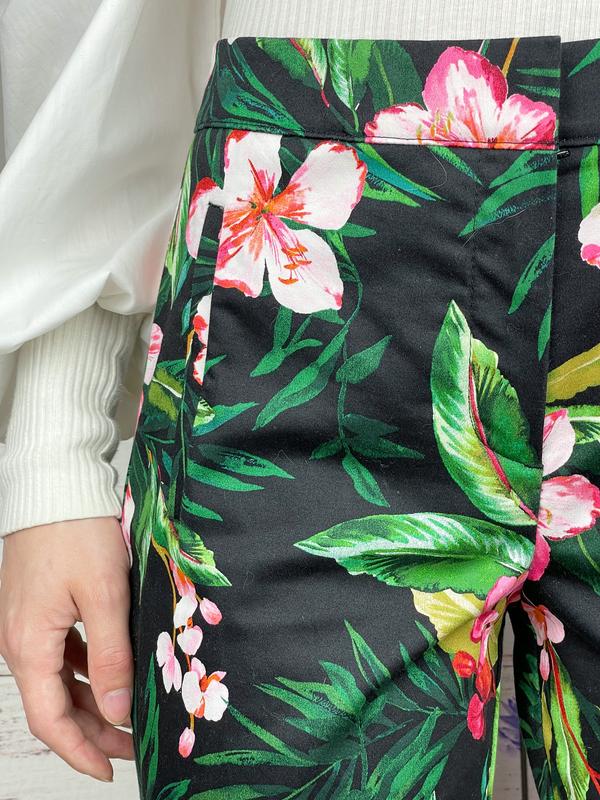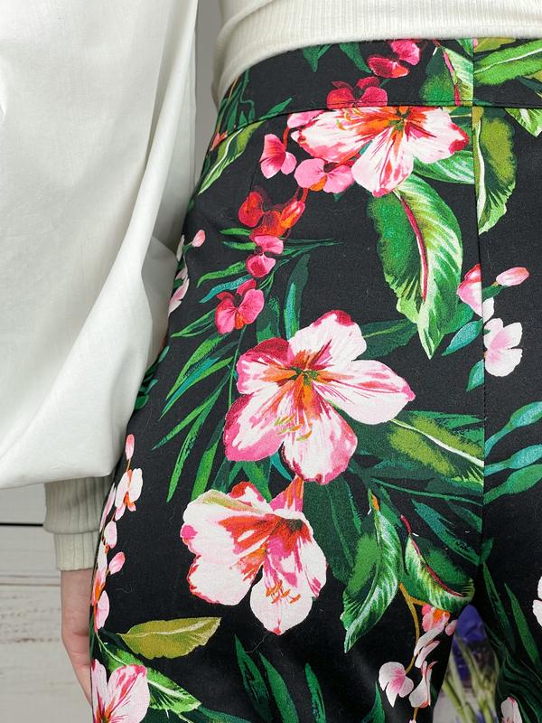 Чорні брючки в квітковий принт 🌺🖤 кишені імітація , застібка на блискавку , гачок і ґудзик