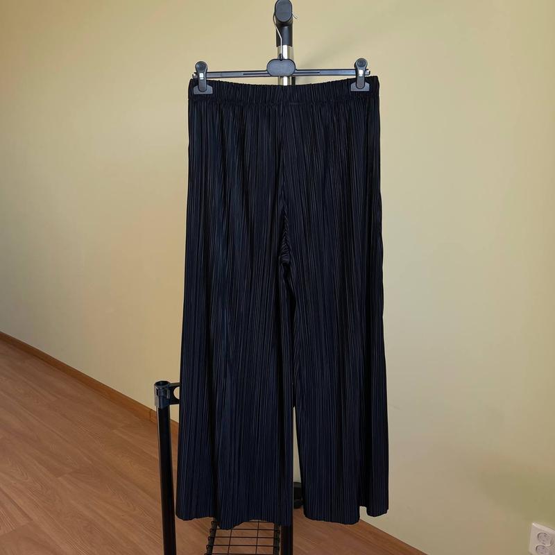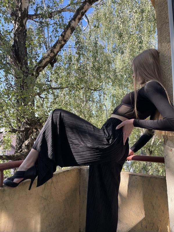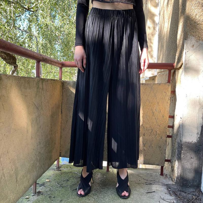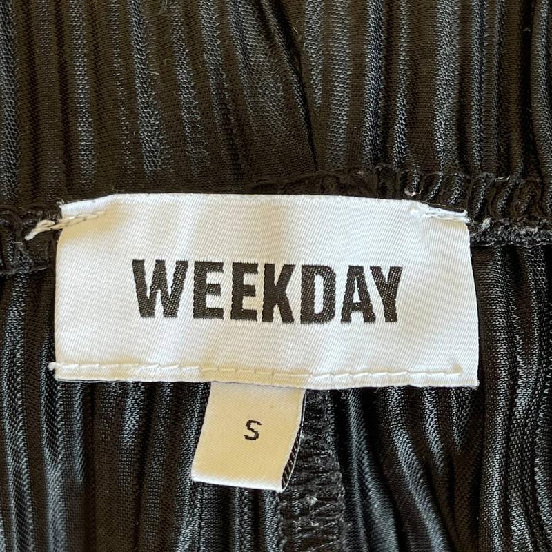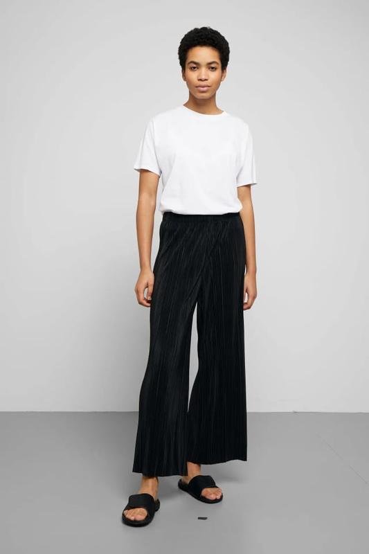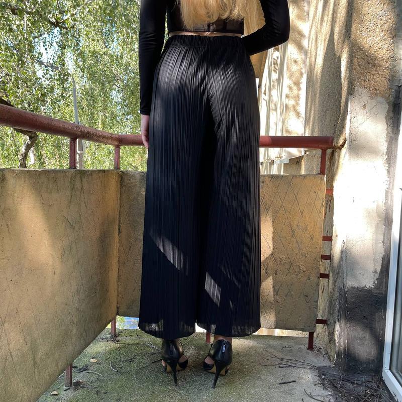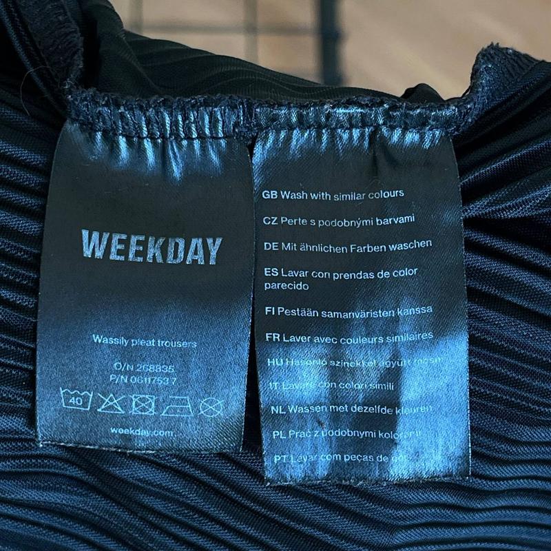 Жіночі плісе штани-палаццо Weekday з блискучою обробокою матеріалу. Вони мають еластичний пояс, занижену талію та необроблені краї.