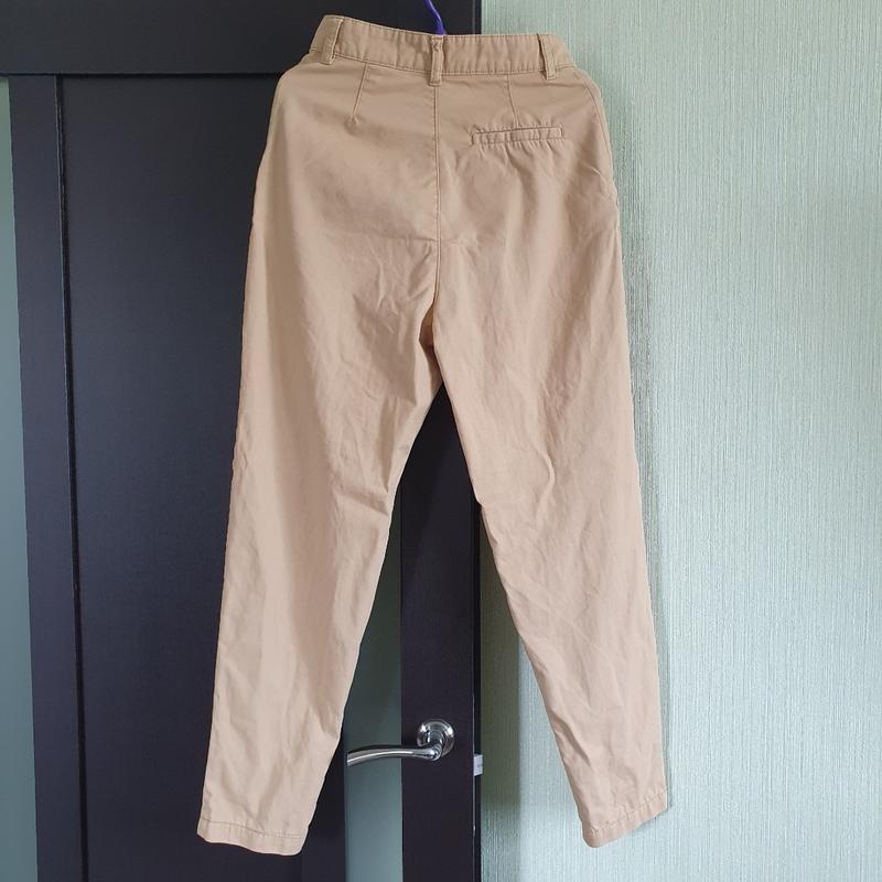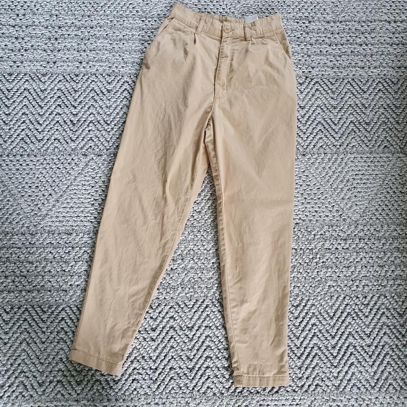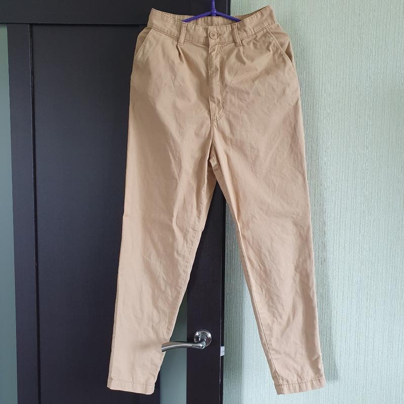 Гарні штани зі 100% бавовни, розмір s. Стан чудовий, є невеличке покошлачення, трохи світлішого кольору, ніж самі штани (див.фото)Заміри: талія 32, стегна 50, довжина 103, посадка 35/39