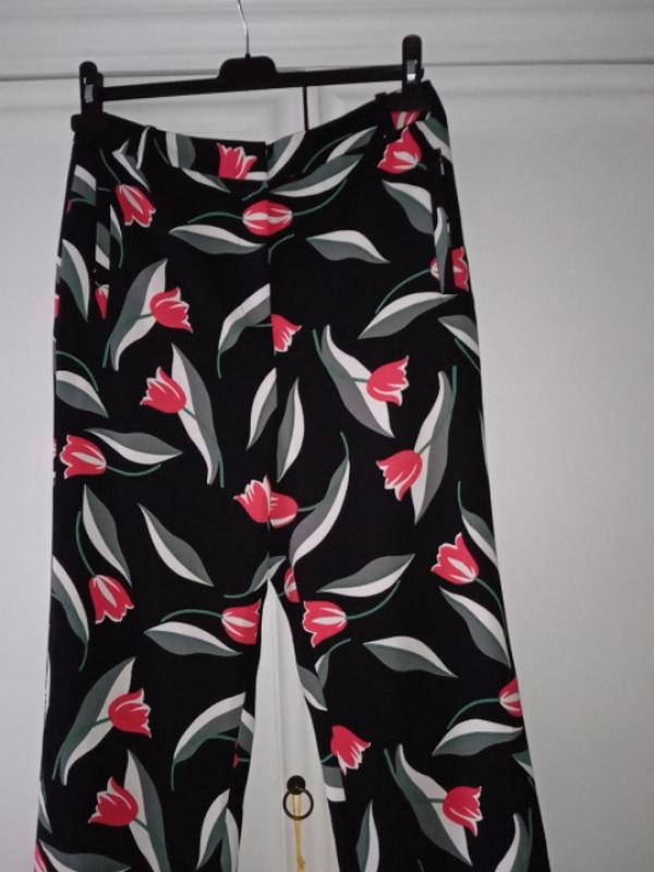 продам нові літні брюки з легкого матеріалу,красивий квітковий принт нові, класичного крою, трохи завужуються до низу,по боках невеликі розрізи.Стан ідеальний без дефектів.Попереду застібається на блискавку.Розмір М,.