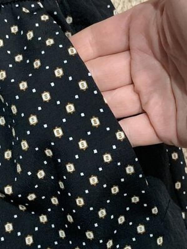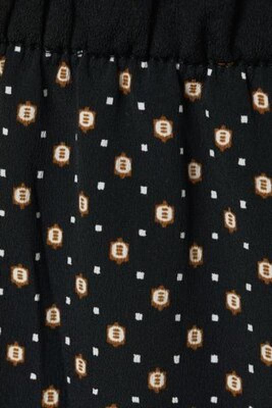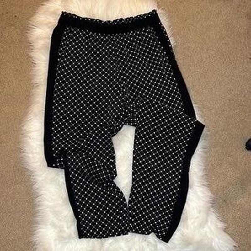Штани з крепової тканини з гумкою на талії й бічними кишенями. Висока талія й завужені донизу, укорочені штанини. Контрастні лампаси смуги з боків. Поліестер у складі штанів — частково перероблений.