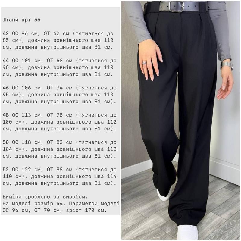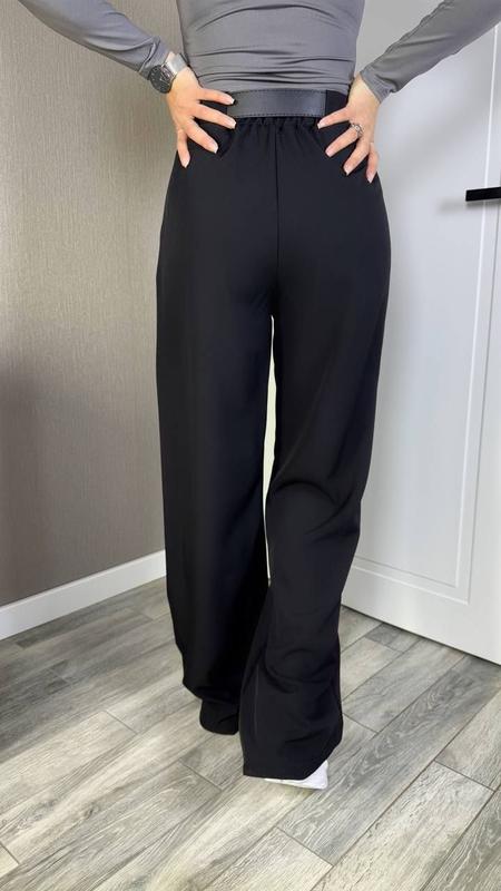 Штани застібаються на блискавку та ґудзик, позаду талія на резинці для більш зручної посадки, з двома карманами, штани вільного крою, тканина дуже приємна до тіла, гарно спадає, трошки тягнеться
