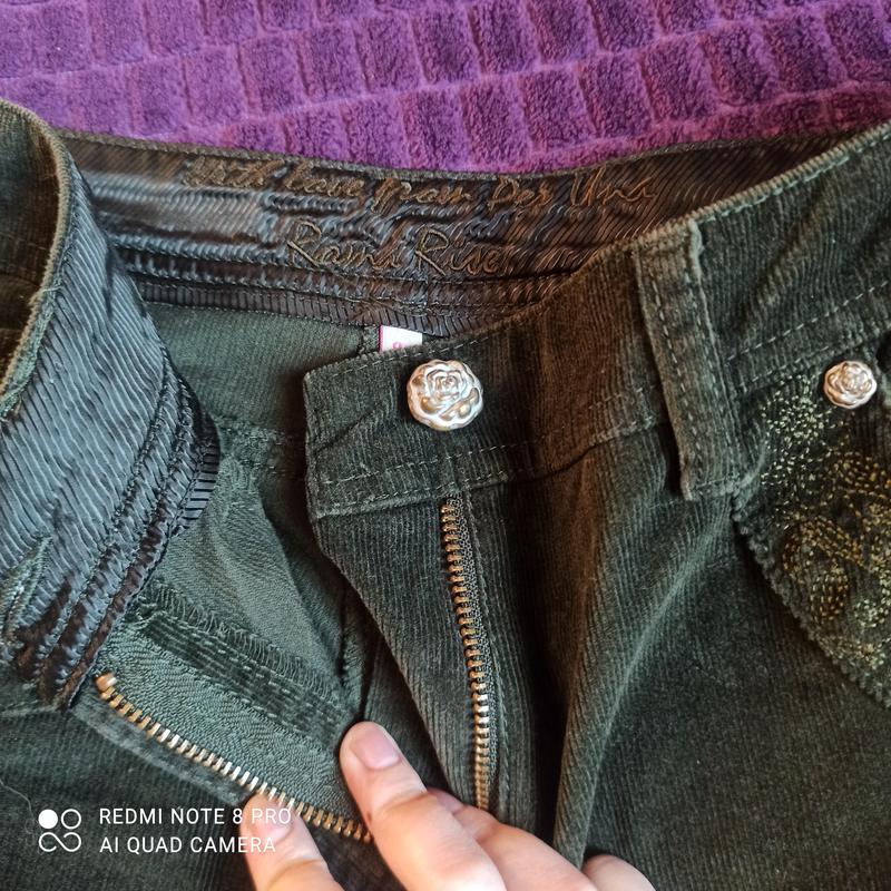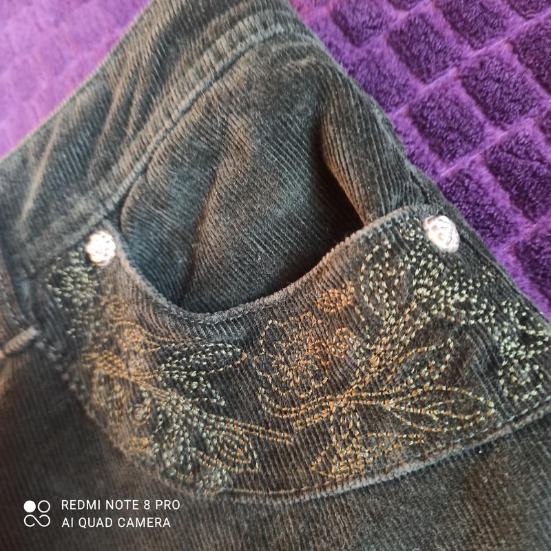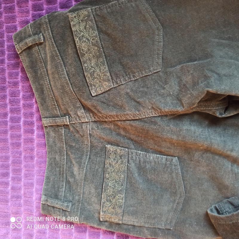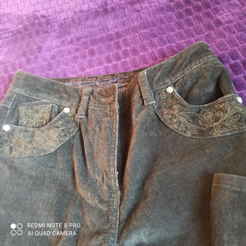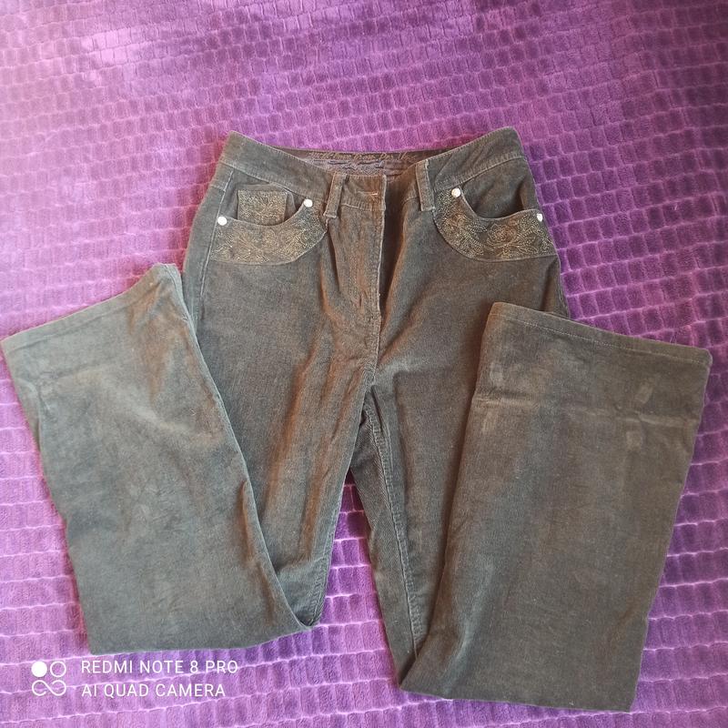 вельвет колір оливковий дефектів немає,трохи кльош,склад:98коттон ,2%еластан,розмір 8(розмір 28-29),на стегна 100см,довжина штанів-97см,в талії-39,5 см