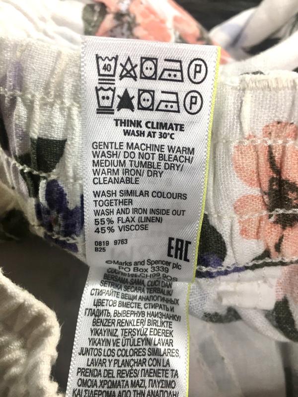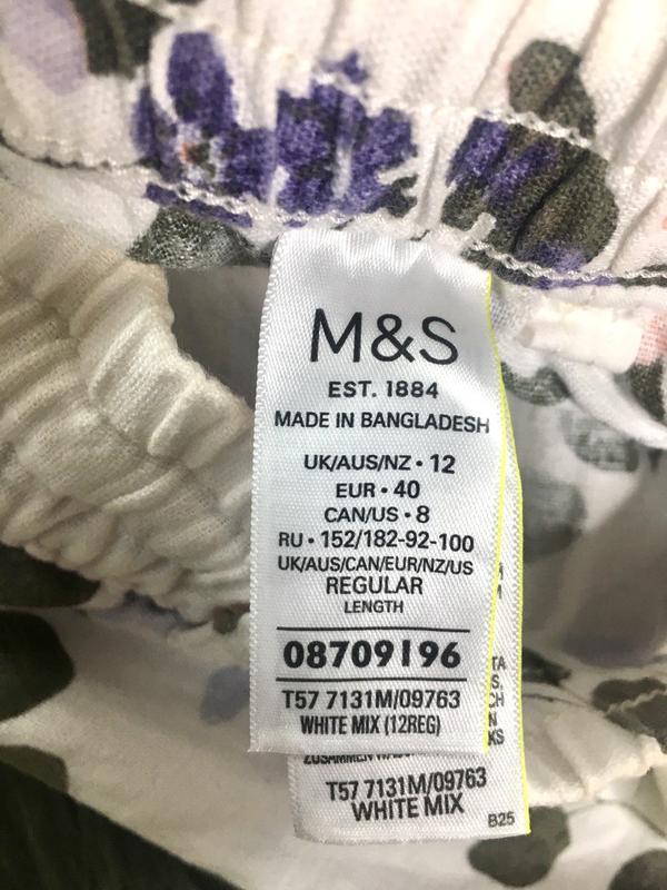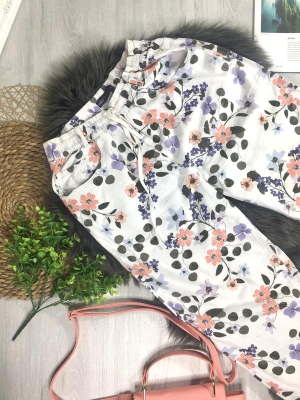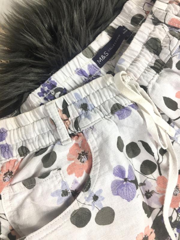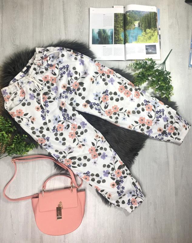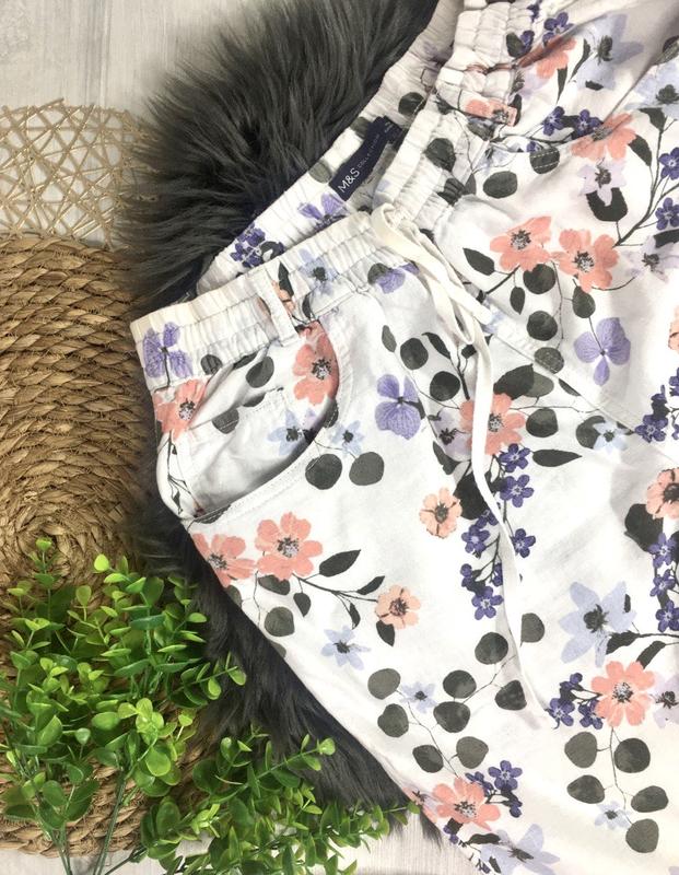 Лляні брюки з квітковим принтом Розмір 12uk ПІТ 36 см, тягнеться до 46 см ПОБІДИ 53 см, тягнеться до 57 см Посадка спереду 29 см, ззаду 41 см Довжина 98 см , по внутрішньому шву 67 см Склад: льон, віскоза
