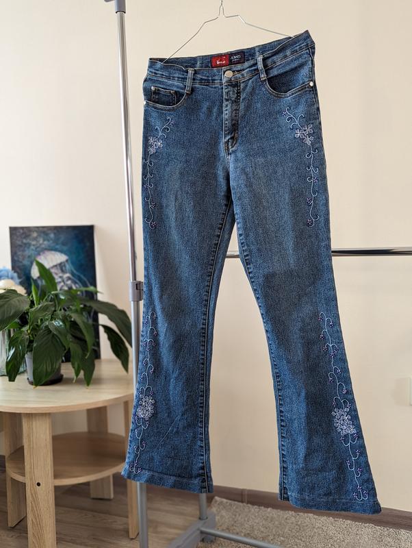 💛 Трендові довгі труби джинси палаццо кльош від коліна, штани-труби з вишивкою з бісеру в квіти/квітковий принт😱