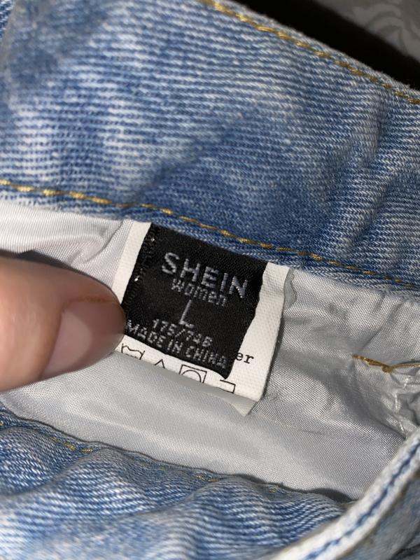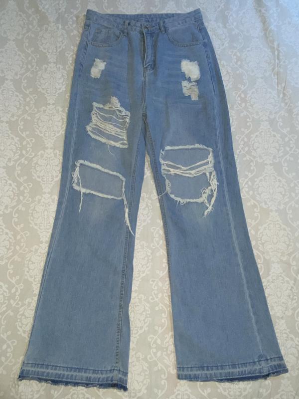 Жіночі джинсові штани shein. Блакитного кольору з імітацією потортості та прорізами, дірками. У поясі на блискавці та гудзику. Попереду 3 кишені та 2 кишені ззаду. До низу штанин іде клеш. Тканина щільна, м'яка, не тягнеться. Стан дуже хороший.
