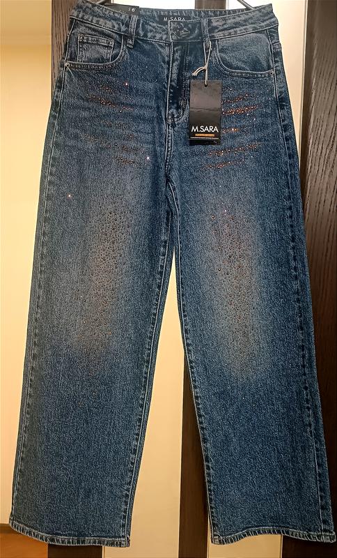 ✨ Джинсы M.SARA со стразами — стиль и блеск в каждой детали! ✨ Модные джинсы прямого кроя от бренда M.SARA, украшенные мелкими блестящими стразами по всей длине. Отлично сидят на фигуре, подойдут под кеды, ботинки или каблуки. Плотный качественный деним, приятный на ощупь. 📏 Параметры: Размер: S(ФОТО 1-7) Длина : 103 см Полуобьем в бедрах 47 см Ширина в поясе: 39 см 💎 Состояние: новое ФОТО 8,9 ЕСТЬ ВСЕ РАЗМЕРЫ! Отправка: Новая Почта / Укрпочта Пиши — отвечу быстро 😊
