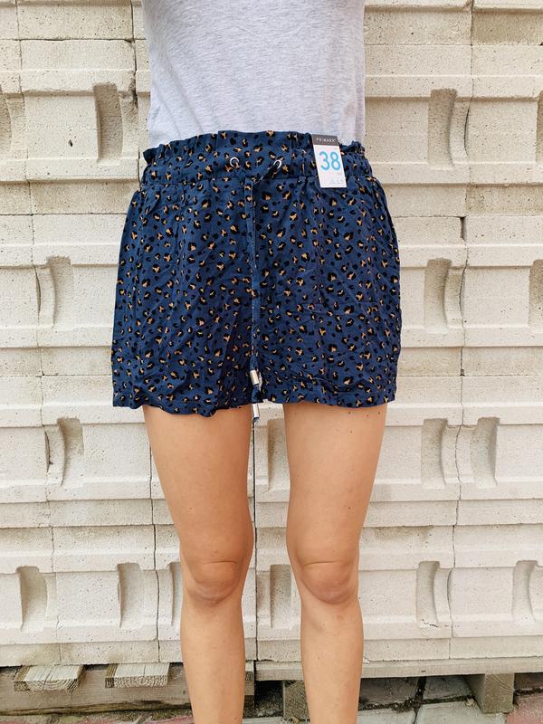 Літні шорти в анімалістичний принт, середня посадка, є пояс, який регулюється, без карманів. Шорті тоненькі, легкі, приємні на дотик. Колір: синій. Річ нова, з біркою. Зріс моделі 170см.