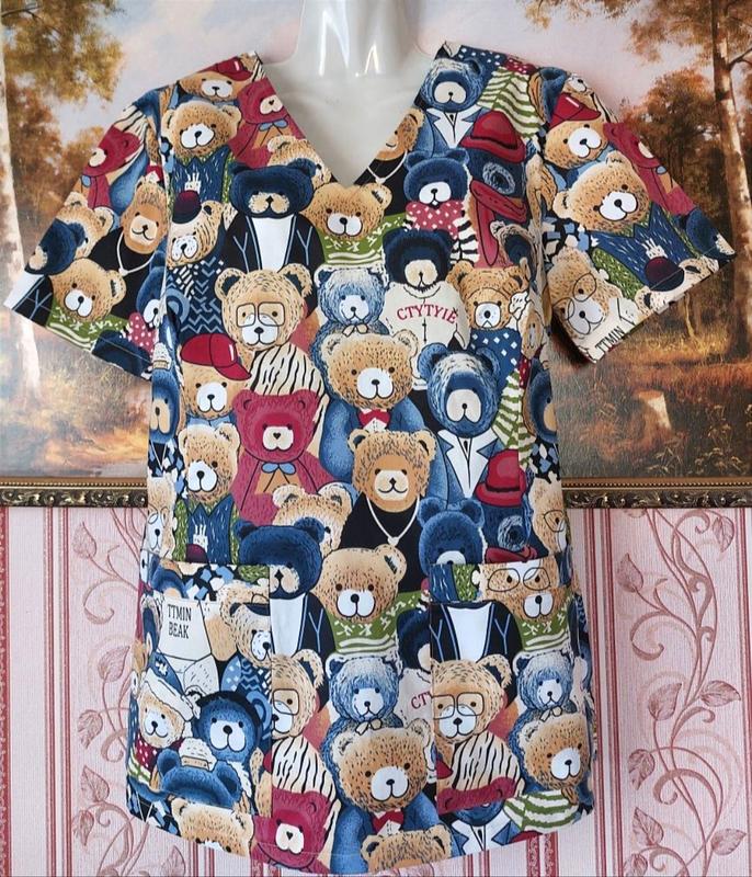 Медичний жіночий топ, блуза з ведмедиками Тедді в бежево коричневих кольорах з бавовни