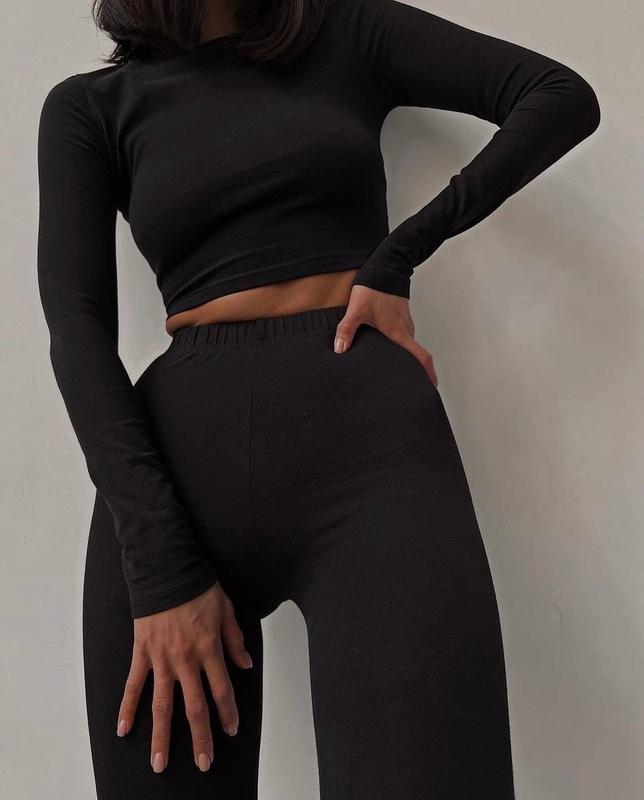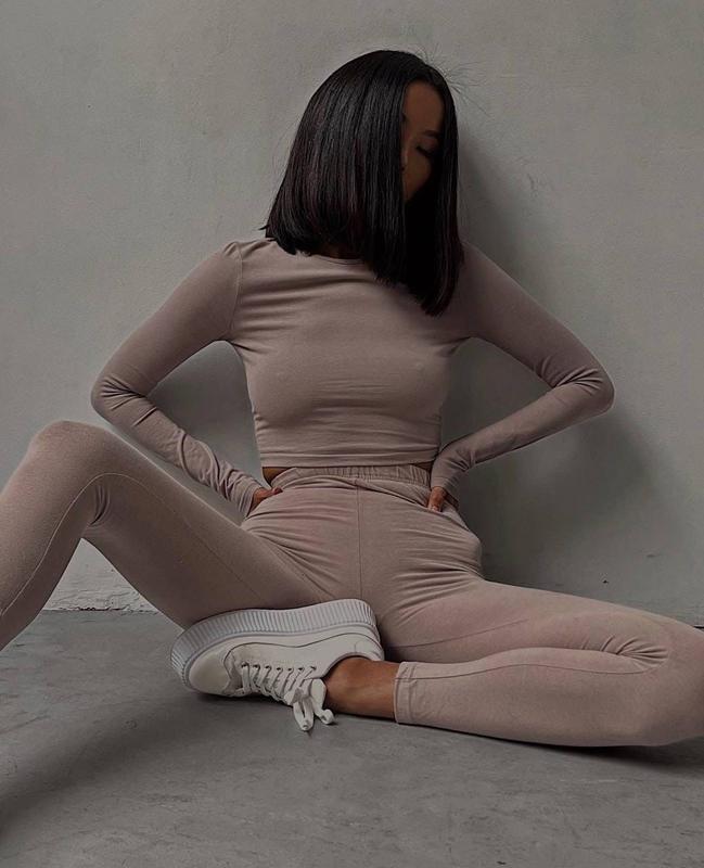 Базовый обтягивающий костюм из мягкой, приятной на ощупь ткани. Подходит как для зала, так и для прогулок. Топ укороченный, леггинсы высокой посадки. Качественный пошив. Ткань хорошо тянется