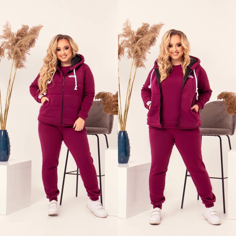 🔥НОВИНКА🔥 Спортивный костюм тройка Качество отличное Модель 1101 Цвета: чёрный, джинс, шоколад, марсала, темно- синий. Материал: трехнить на флисе Наполнитель жилетки синтепон 150 Размеры: 48-50, 52-54, 56-58, 60-62. ✅Замеры: 48-50 Кофта: длина- 64 см, ОГ- 112 см, длина рукава от шва- 62 см Штаны: длина- 102 см, ОБ- 116 см Жилетка: длина- 69 см, ОГ- 114 см ✅Замеры: 52-54 Кофта: длина- 66 см, ОГ- 118 см, длина рукава от шва- 63 см Штаны: длина- 105 см, ОБ- 124 см Жилетка: длина- 70 см, ОГ- 120 см. ✅Замеры: 56-58 Кофта: длина- 66 см, ОГ- 126 см, длина рукава от шва- 63 см Штаны: длина- 105 см, ОБ- 130 см Жилетка: длина- 71 см, ОГ- 128 см ✅Замеры: 60-62 Кофта: длина- 67 см, ОГ- 136 см, длина рукава от шва- 64 см Штаны: длина- 109 см, ОБ- 138 см Жилетка: длина- 71 см, ОГ- 138 см