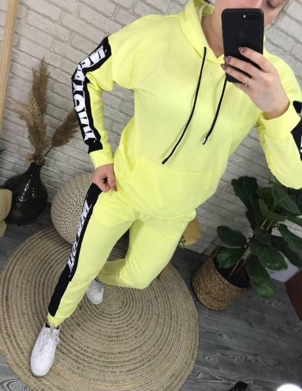 Яскравий спортивний костюм. Виконаний з м'якого трикотажу-двохнитки, стане улюбленою річчю для тих, хто цінує практичність і не забуває про модні тенденції. У комплект входять штани комфортної посадки на еластичній резинці+шнурки фіксатори. З бічними кишенями і манжетами. Доповнені принтованими лампасами. А також комфортне худі з капюшоном на кулісці. Спереду кишеня-кенгуру. Рукава декоровані накатами, з ідентичним штанам принтом. колір лимон 3шт 40р довжина верх 59см., рукав 56см., штани 100см., груди 78-82см талія 62-66см стегна 84- 88см 6шт 42р довжина верх 59см., рукав 57см., штани 100см., груди 82 - 86см талія 66 - 70см стегна 88 - 92см 4шт 44р довжина верх 60см., рукав 58см., штани 100см., груди 86 - 90см талія 70 - 74см стегна 92 - 96 6шт 46р довжина верх 61см., рукав 59см., штани 100см., груди 90 - 94см талія 74 - 80см стегна 96 - 100 см 9шт 48р довжина верх 62см., рукав 59см., штани 101см., груди 94 - 98см талія 80 - 84см стегна 100 - 104см