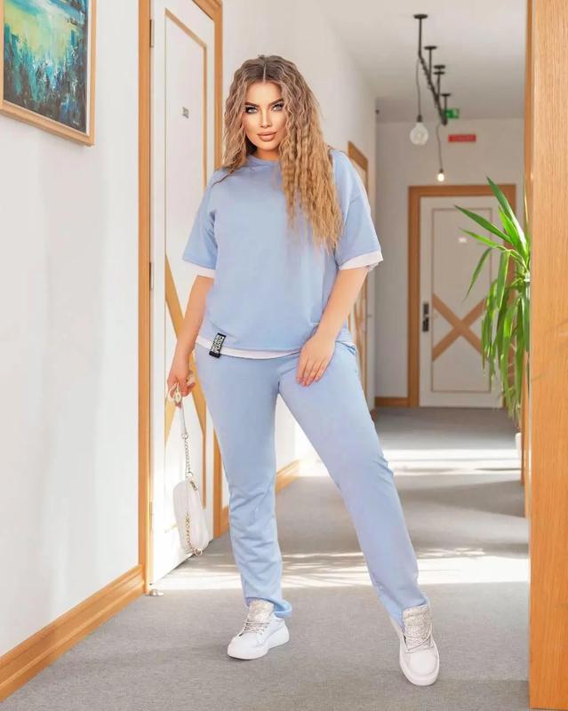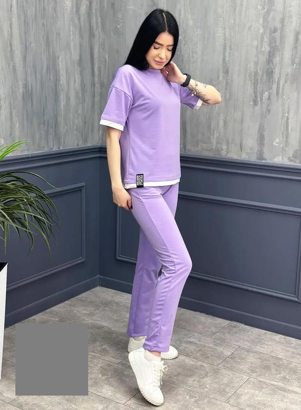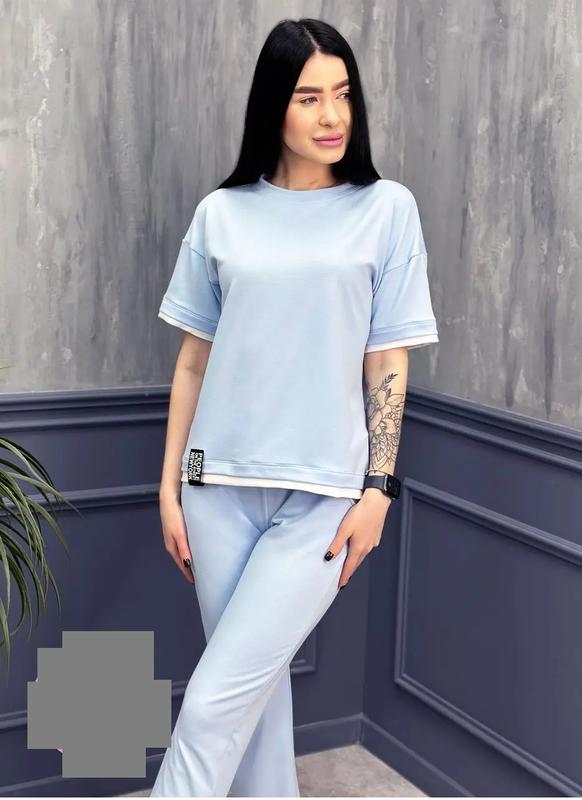 Трикотажний літній костюм пошитий із двонитки. Цей матеріал не тільки добре переносить прання та довго зберігає яскраві кольори, але й дуже приємний до тіла. Костюми з двонитки рекомендується прати за низької температури (30-40 градусів) і прасувати на мінімальному режимі.