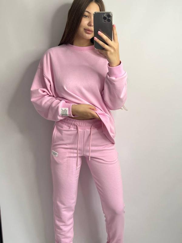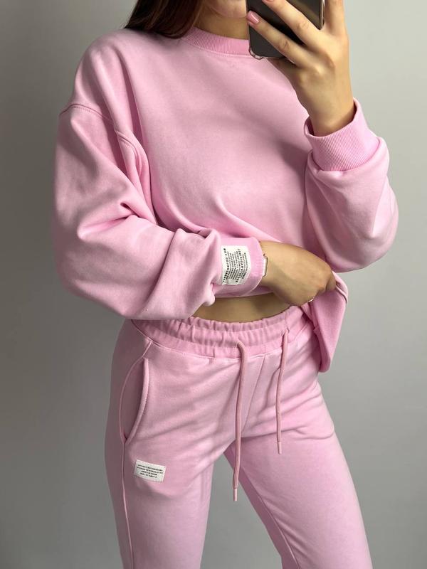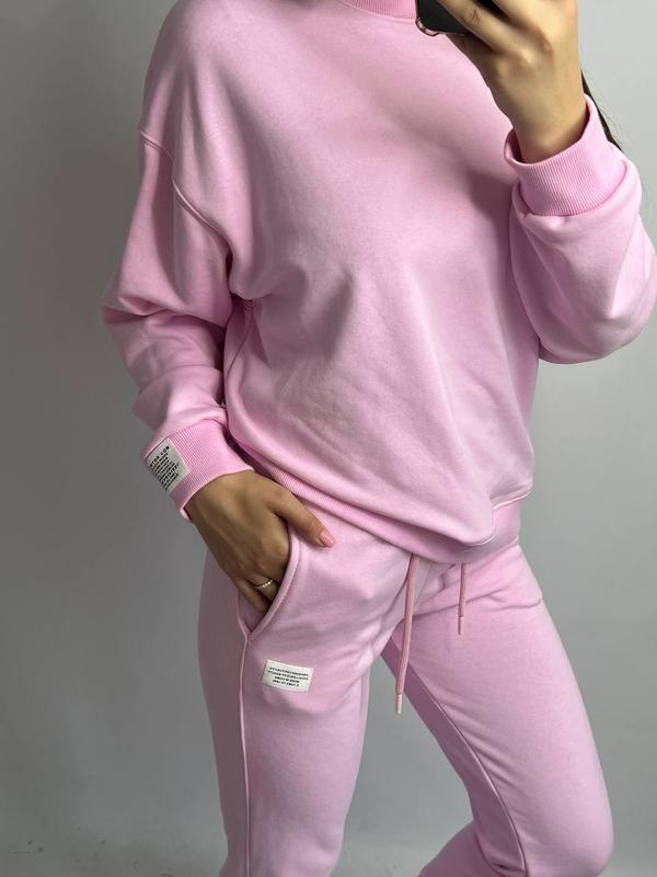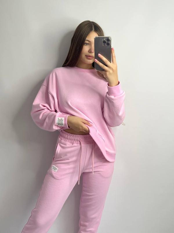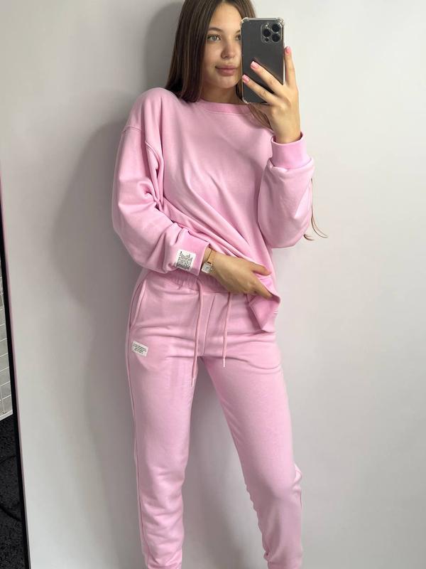 Штани костюму мають дві прорізні кишені, широку прошиту резинку на поясі та шнурки для додаткової фіксації. Об’ємний світшот з стильною нашивкою на рукаві та є широкі резинки-манжети на рукавах та низу кофти.