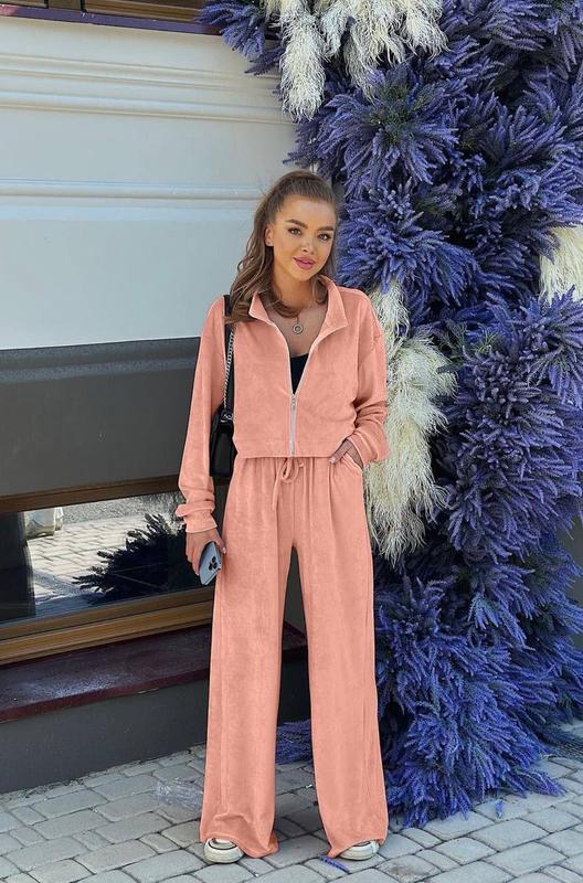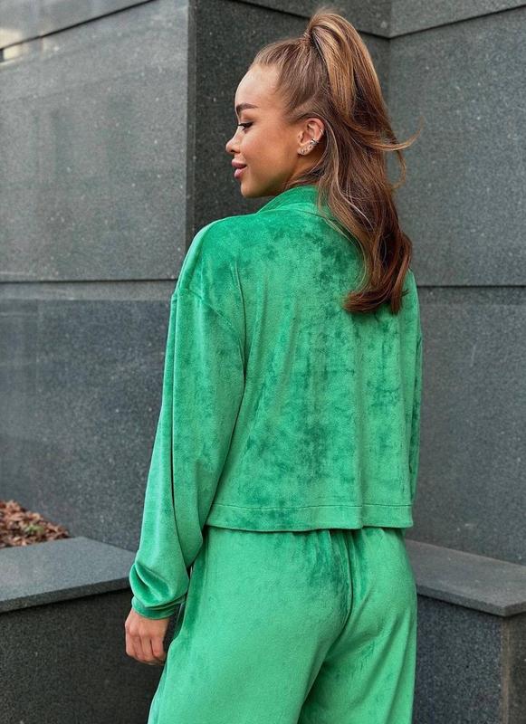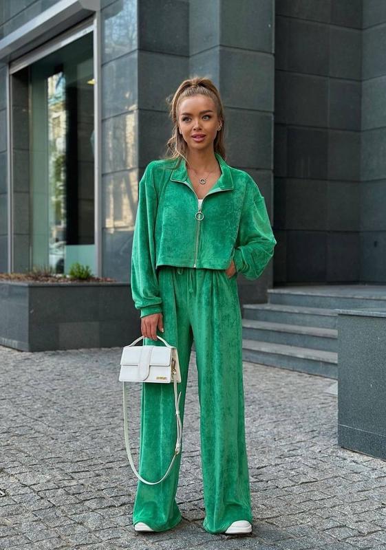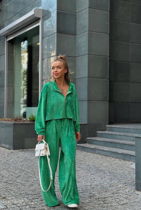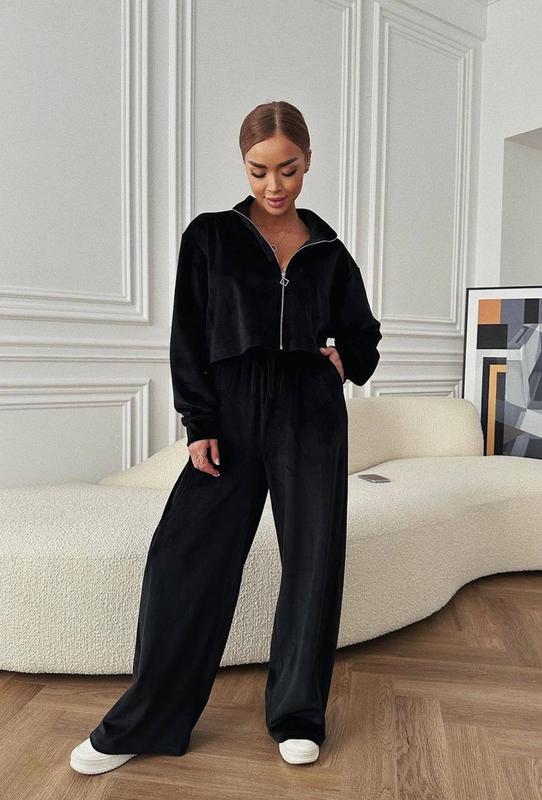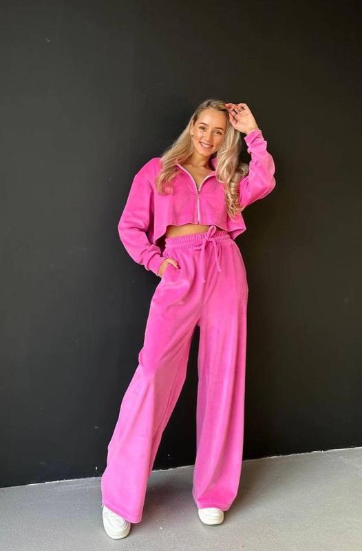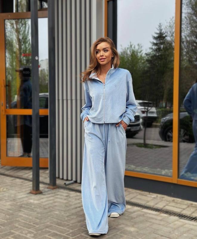 Костюм виготовлений з якісної м’якої і приємною на дотик тканини велюр плюш. Фасон костюма спортивний. Зручний і комфортний для прогулянок. З таким костюмчиком твій настрій буде завжди суперовий.