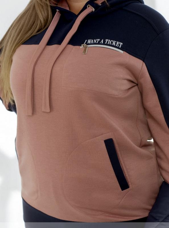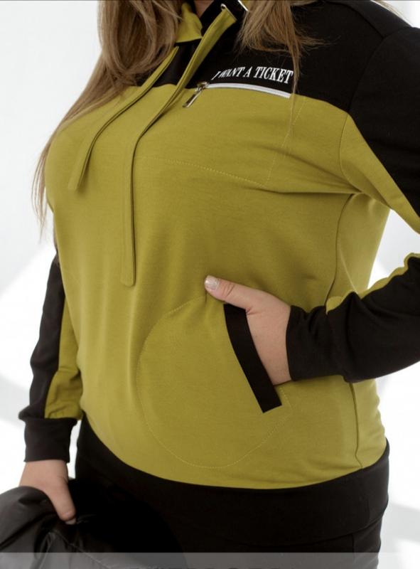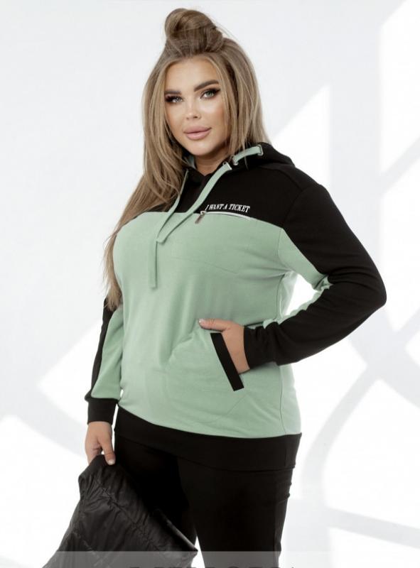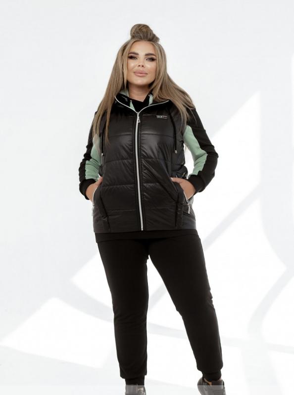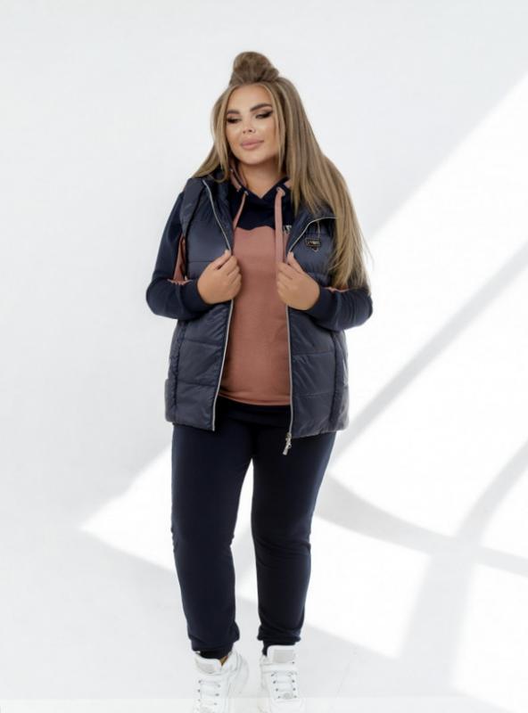 Універсальний костюм 3-ка - який додасть кольору та зробить ваш образ унікальним. Костюм складається з жилета з капюшоном та тонкою підкладкою. По боках врізні кишені з блискавками. Яскрава контрастна кофта з капюшоном, через який пропущено шнурок з люверсами.