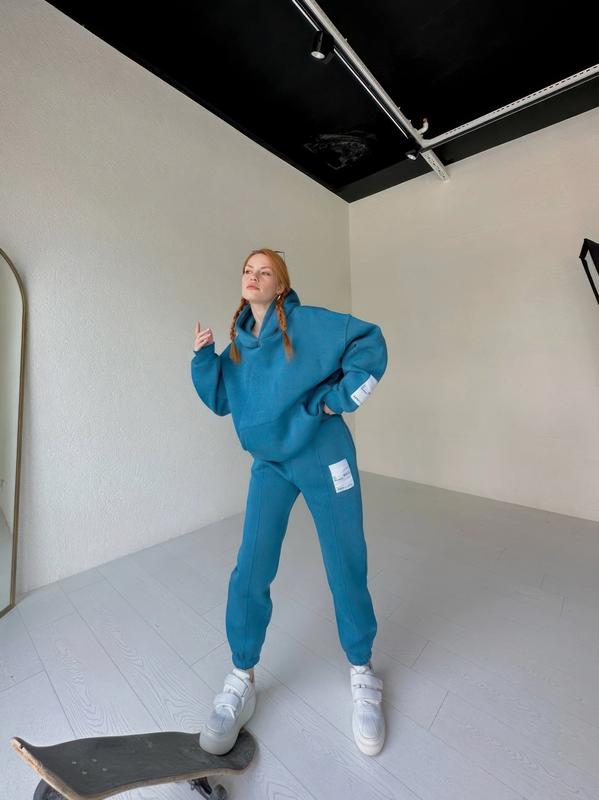 Стильний костюм із оригінальними нашивками. Зручний, теплий та об'ємний. Ідеальна посадка, відмінне пошиття. На штанях декоративні стрічки.