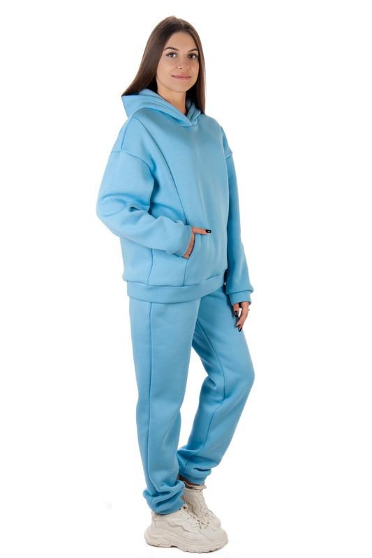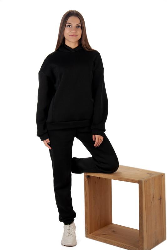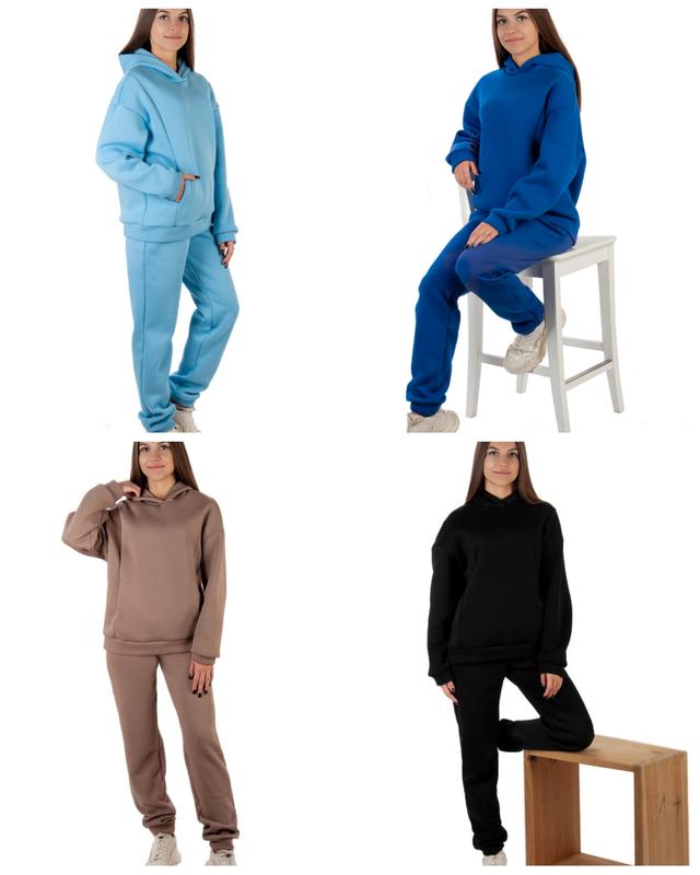 Теплий та комфортний костюм для жінок, виготовлений із полотна "Тринитковий футер на флісі". Модель стильна та практична, складається зі штанів та худі, штани мають по низу широкі еластичні манжети, худі вільного крою, по боках розташовані кармани. Комплект виконаний в різноманітній палітрі кольорів, на будь-який смак, чудово підійде для використання в холодну пору року. Тканина щільна, має густий фліс з виворотної сторони, чудово зберігає тепло.