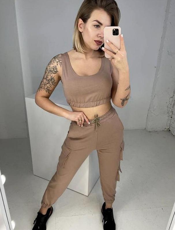 Спортивний жіночий костюм на кожен день. Виконаний з м'якого і еластичного трикотажу двунітка середньої щільності. Укорочені топ з широкими бретелями і резинкою по низу. Завужені штани середньої посадки з широкою гумкою, прорізними і накладними кишенями. колір мокко розмір 46 (Л)