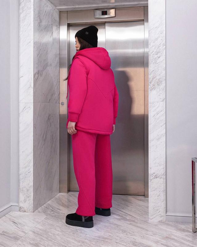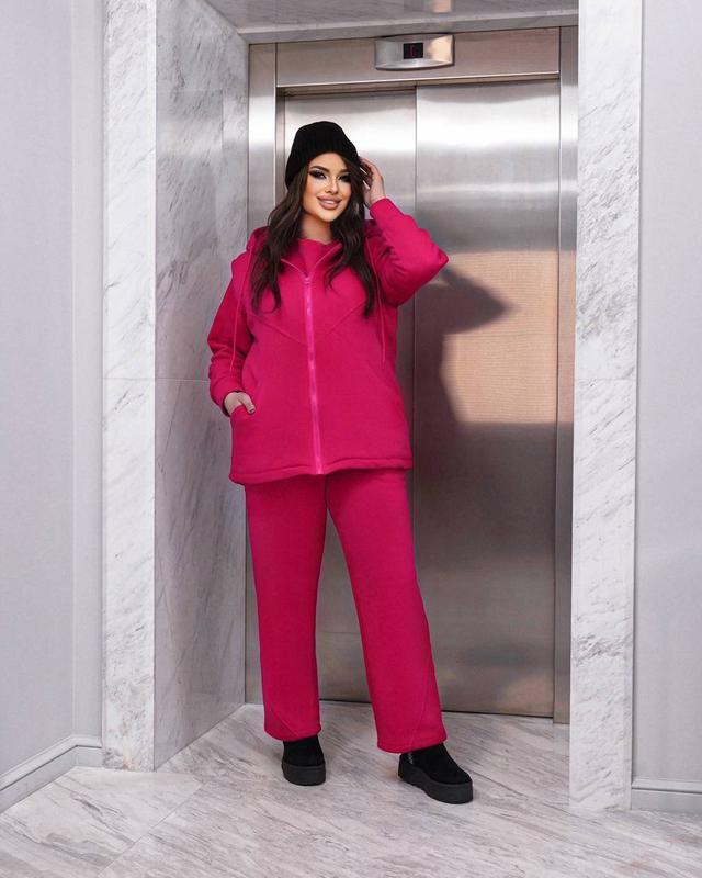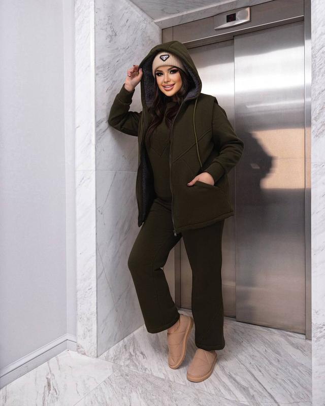 ▪️Кофта: рукав-реглан на манжеті, по низу манжет; штани : на резинці , з боків кишені , вільний низ цікавим кроєм ; жилет на молнії в колір основи, з боків глибокі кишені, основа жилету та капюшон на теплій, мʼякій овчині, глибокий капюшон на канаті