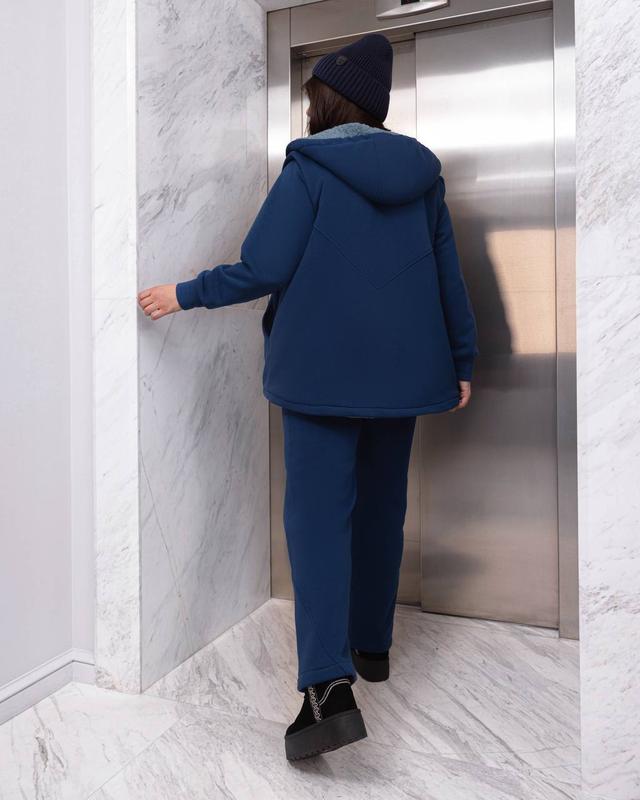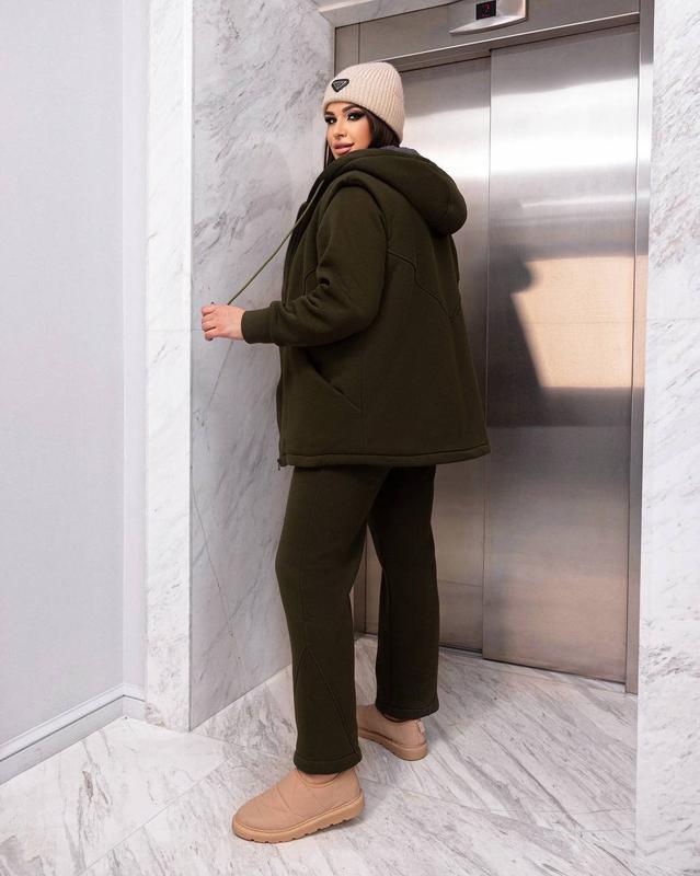 ▪️Кофта: рукав-реглан на манжеті, по низу манжет; штани : на резинці , з боків кишені , вільний низ цікавим кроєм ; жилет на молнії в колір основи, з боків глибокі кишені, основа жилету та капюшон на теплій, мʼякій овчині, глибокий капюшон на канаті