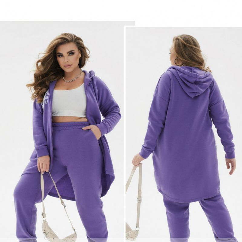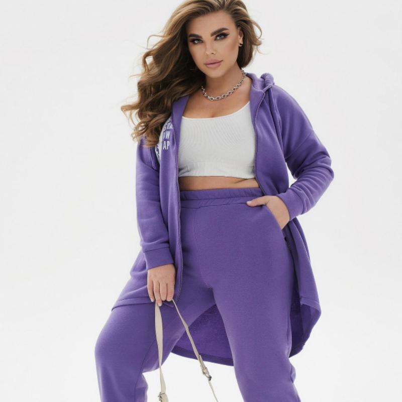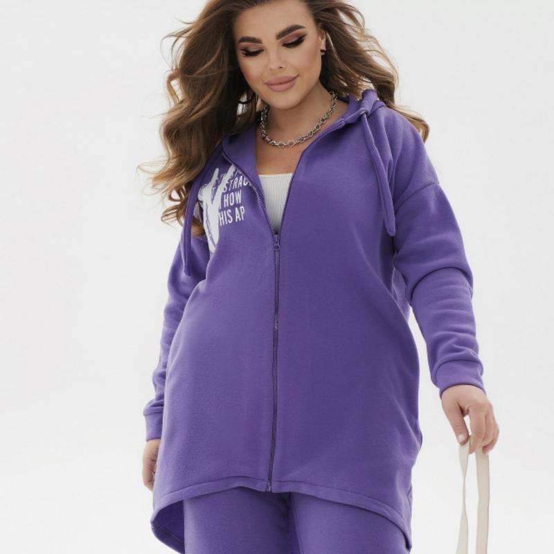 Костюм, який точно вартує вашої уваги. Яскраві кольори та зручний крій - головні елементи для вашого комфорту. Подовжена кофта зі спущеним плечовим швом на блискавці в тон костюму. Рукава на манжетах. Виріб також доповнено капюшоном зі шнурівкою. Права частина декорована термоналіпкою. Поділ кофти подовжено по спинці та заокруглено.