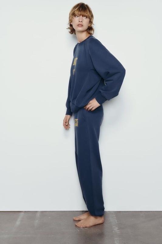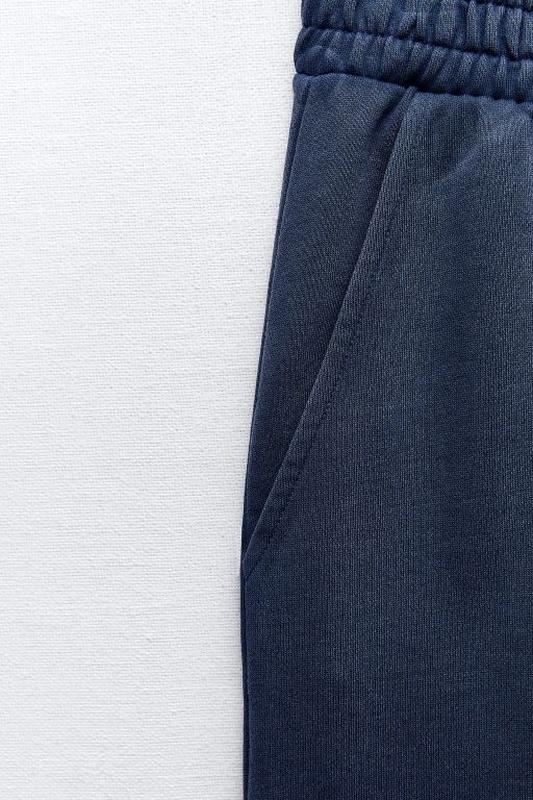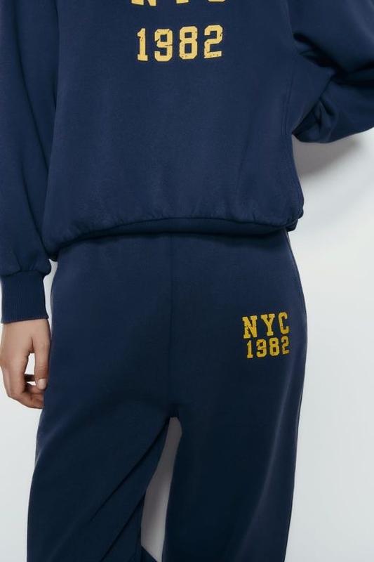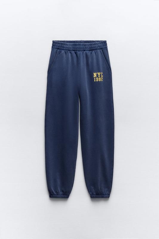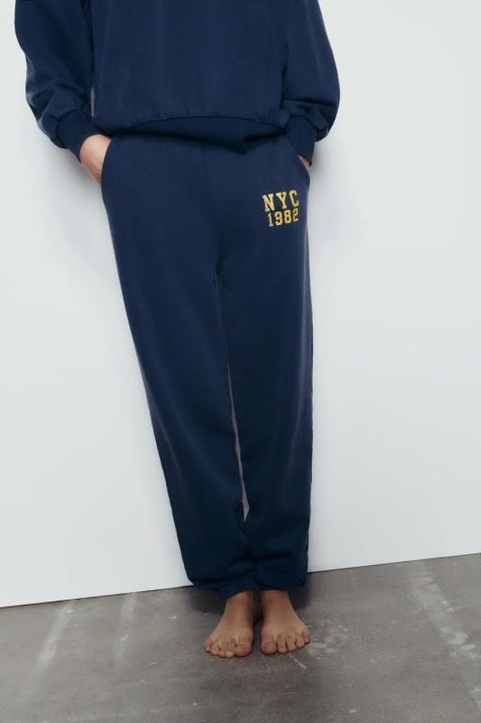 Штани з контрастною вишивкою, еластичним поясом і високою посадкою. Кишені по боках і еластичні манжети внизу.