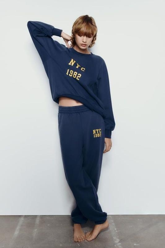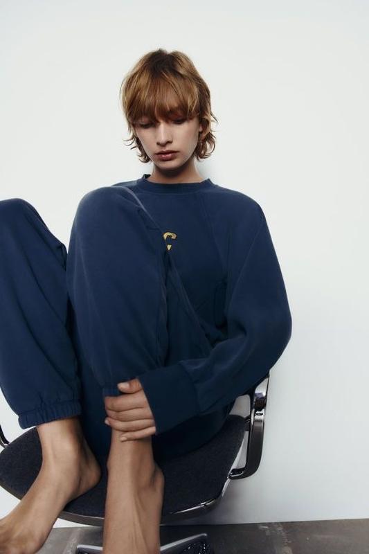 Світшот із круглим коміром і довгими рукавами. Контрастна вишивка спереду та окантовка в рубчик по краях.