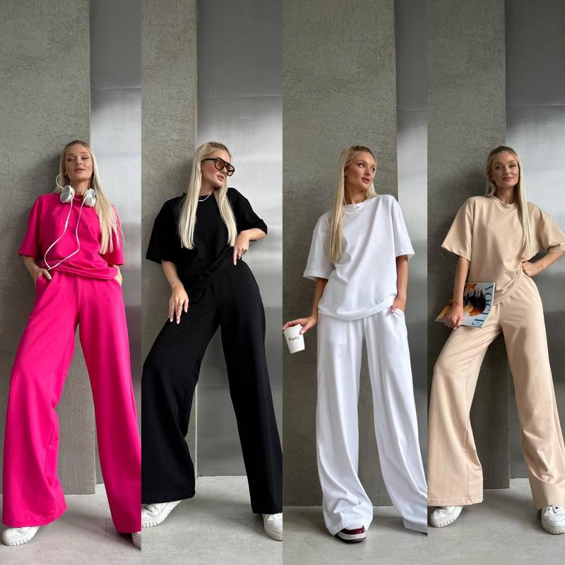 Костюм базовый брючный спортивный женский трикотажный летний весенний палаццо розовый...