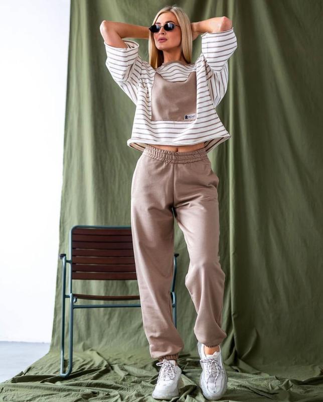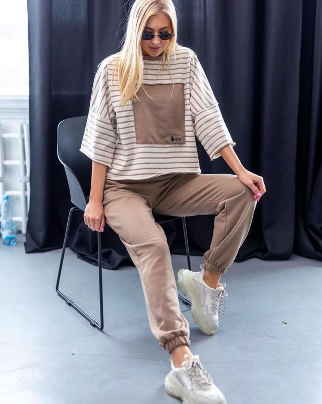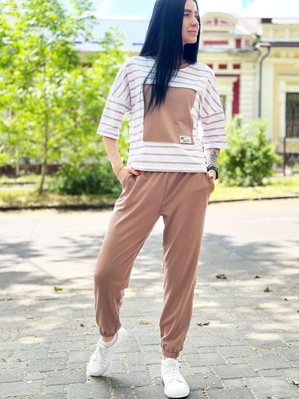 - верх – пряма футболка зі смугастим принтом та однотонною нашивкою у колір штанів, низ – прямі спортивні штани з бічними кишенями;