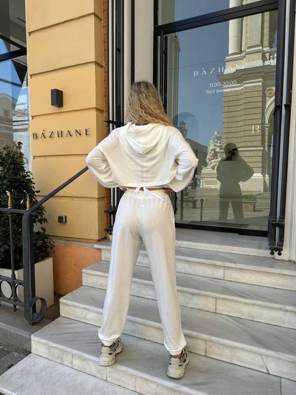 Класний спортивний костюм трійка у високій якості. Худі oversize, вкорочене, топ із декоративними строчками, розмір регулюється затяжкою на спинці, штани на резинці, є кишені. Виглядає дуже стильно та цікаво.