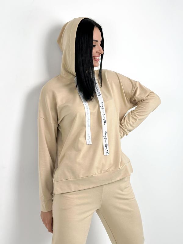 - кофта-худі з капюшоном вільного асиметричного крою з розрізами з боків. Плече вироби спущено, довгі рукави з манжетами.