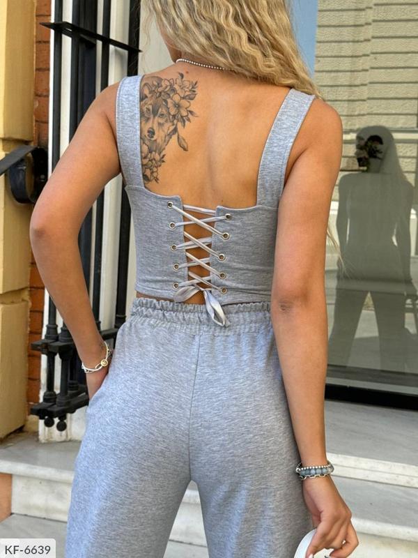 Спортивний костюм Розміри: 42-44, 44-46 Тканина: двухнитка Колір: меланж, білий, рожевий, чорний Класний спортивний костюм трійка у високій якості. Худі oversize, вкорочене, топ з декоративними рядками, розмір регулюється затягуванням на спинці, штани на резинці, є кишені. Виглядає дуже стильно і цікаво. - худий ОГ 124 см Довжина рукава від шиї 75 см Довжина по спинці 37 см -топ ОГ 72-84 / 76-88 см Висота по боці 17 см - штани ОТ 62-74 / 66-80 см ОС 98/102 см Довжина по боці 97 см Довжина крок / шва 70 см