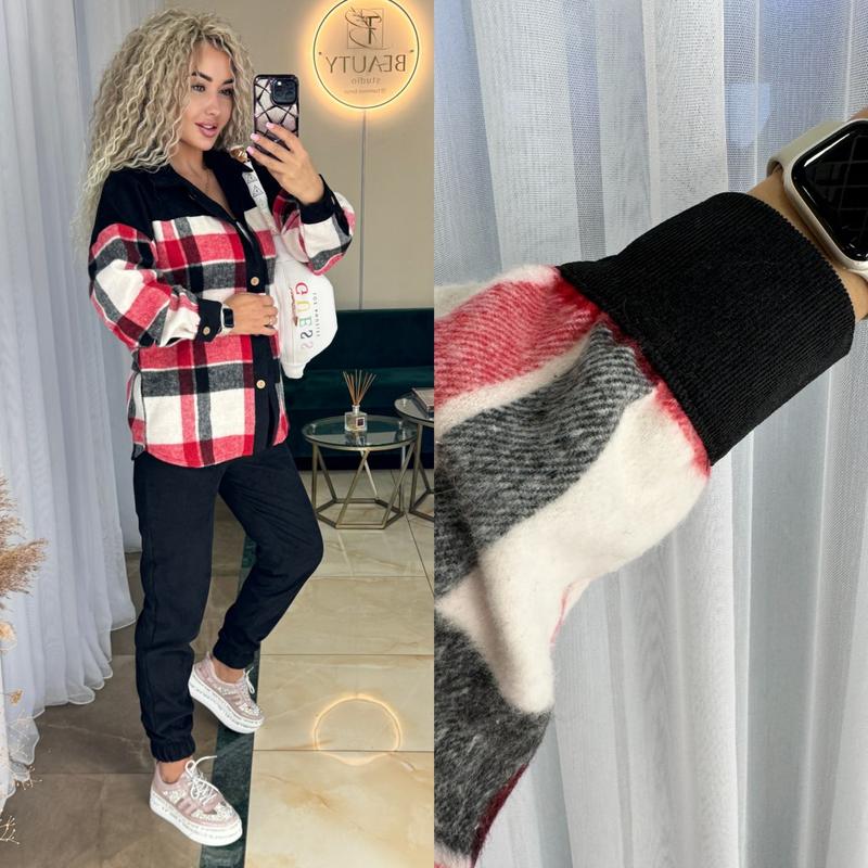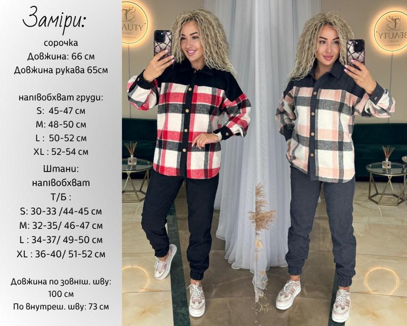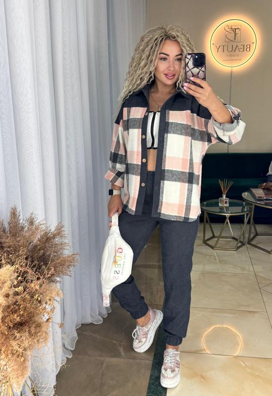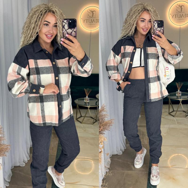 Опис: Стильний жіночий костюм, сорочка комбінована з мікро-вельвєтом на гудзиках, штани-джогери на широкій зручній гумці.