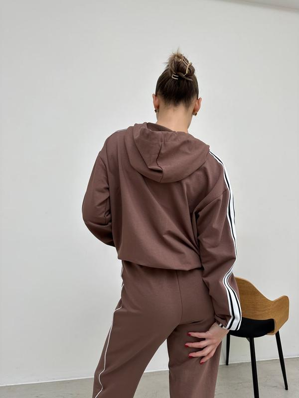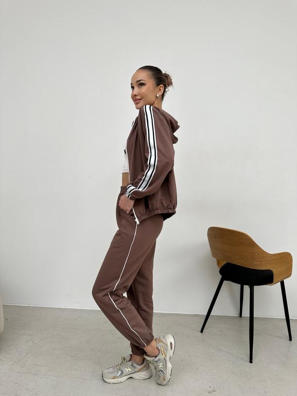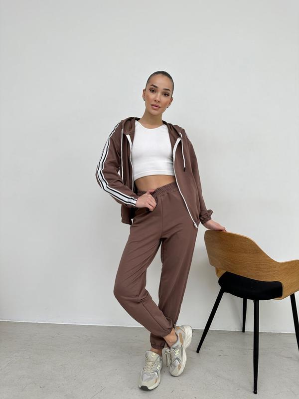 Спортивний костюм виконаний з якісної турецької двонитки. Кофта з капюшоном та на блискавці, на рукавах лампасна стрічка. Низ кофти на резинці. Штани джоггери з бічними карманами.