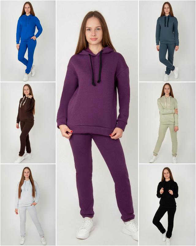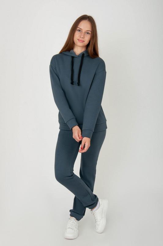 Сучасний костюм виконаний з триниткового футера з начосом пеньє. Модель складається з худі вільного крою та штанів. Худі з капюшоном, штани з кишенями, знизу призібрані на резинці, для зручності вставлений широкий шнурок. Полотно високої якості, з хорошим начосом по вивороті, має хороші теплоізоляційні властивості.