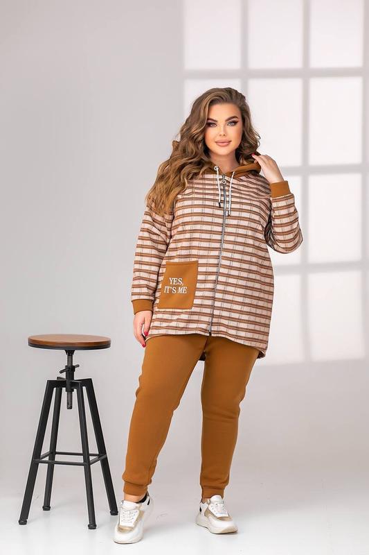 54-56 Длина кофты перед – 75 см, длина кофты сзади 85 см, длина рукава от горла 68, Ог-138 см, длина брюк-102 см, Об-128 см, ОТ резинка-118 см.