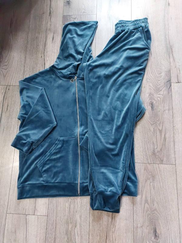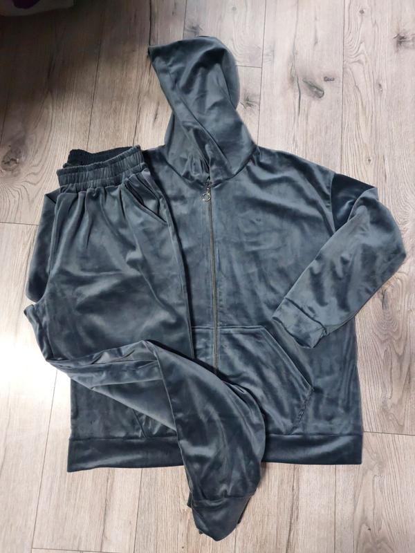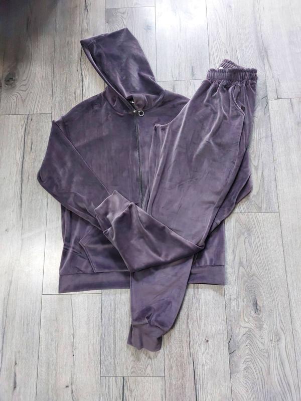 Жіночий спортивний костюм велюровий.Складається із кофти на замок і штанів.Кофта має кишені спереду і капюшон. Штани на резинці, внизу манжети.Кольори: фіолетовий, синій, світло-коричневий і сірий.