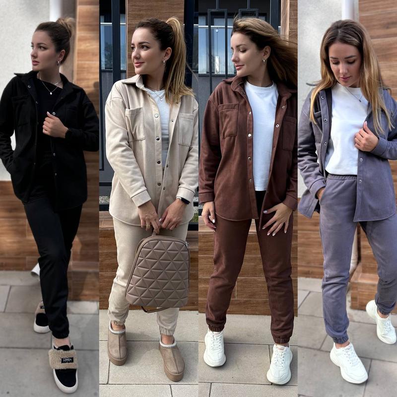 Костюм Тканина замш на плотному флісі Колір чорний, графіт, шоколадний, світлий бежевий Розмір 42-44,46-48,50-52 Костюм сорочка з карманами, застібається на кнопки, штани талія на резинці, з двома карманами, низ штанів на резинці Тканина дуже тепла, не тягнеться Ціна: 880 грн