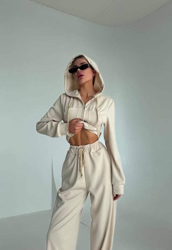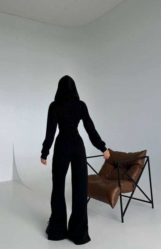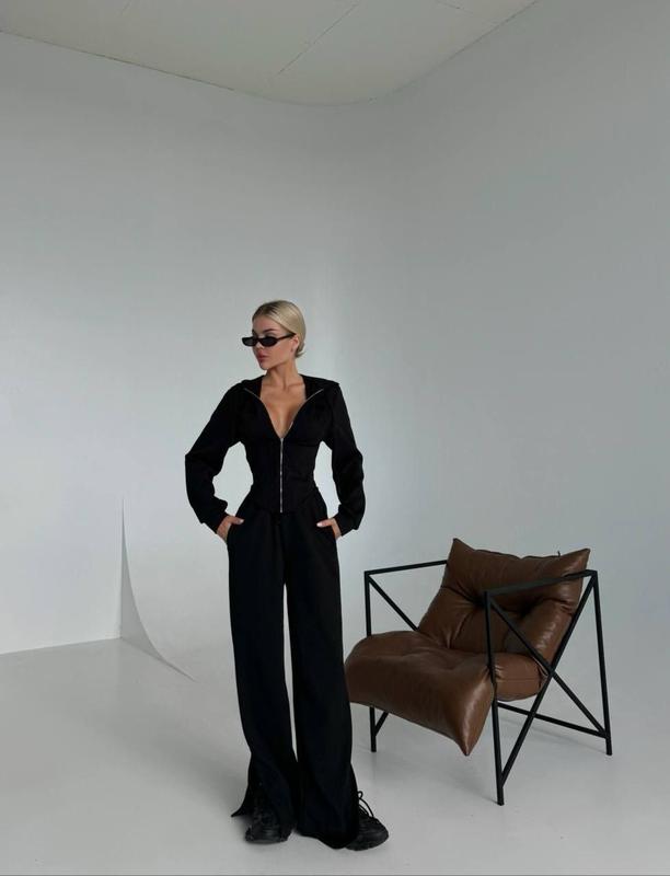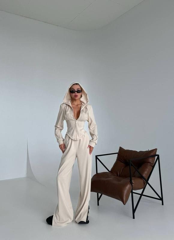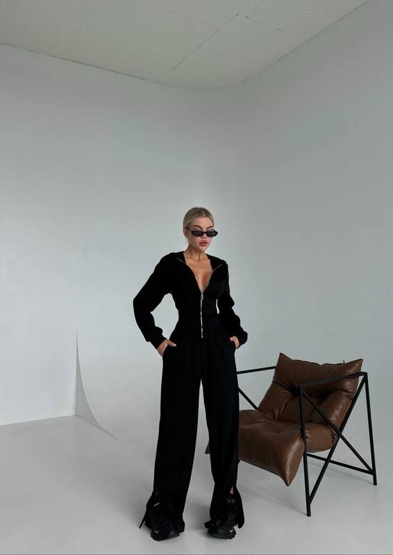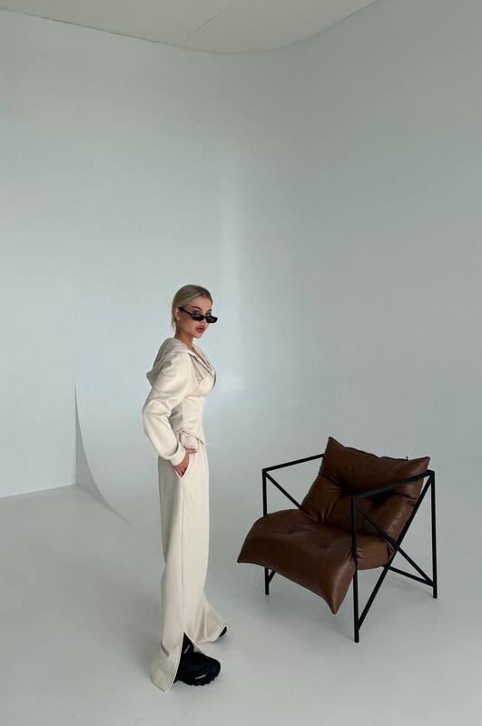Дуже стильний і комфортний костюм на флісі, приємна до тіла тканина, не кашлатиться. Штани висока посадка - має шнурок, прямий крій, в низу з боку розрізи що надає їм оригінальності та грайливості. Кофта на металевій змійці, цікавий крій - завдяки чому дуже гарно підкреслює талію і робить її візуально стрункішою.