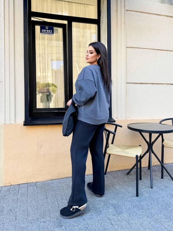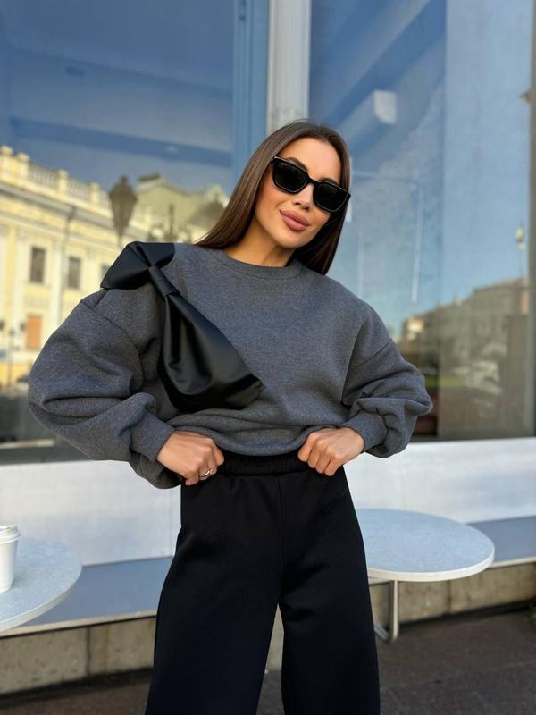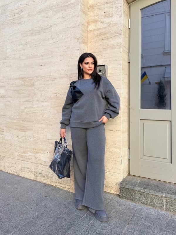 Чудовий дует, який стане вашим улюбленим. Штани із високою посадкою, без кишень. Кофта вільного крою, спущені рукави, бант із еко-шкіри, пришитий.