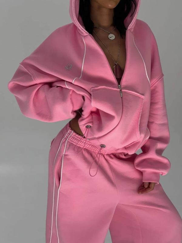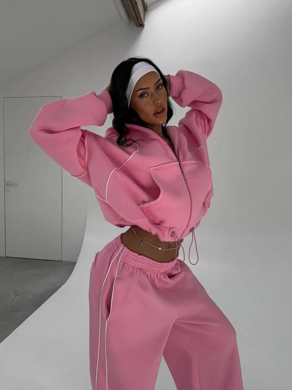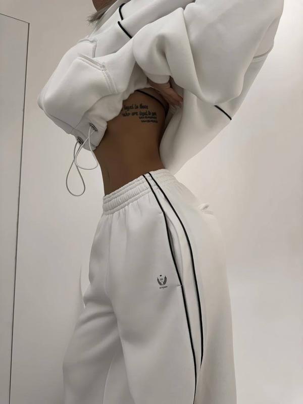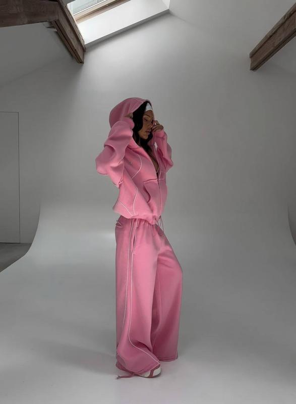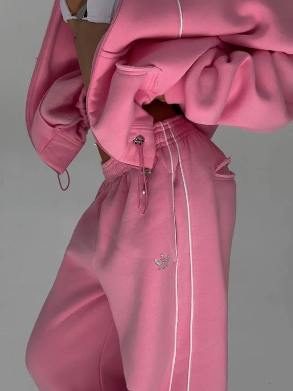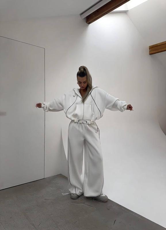 Спортивний костюм oversize чудово підійде для будь-якого випадку. Зручний, виглядає дуже стильно. Штани на високій посадці, з кишенями, кофта на блискавці, внизу регулюється резинками.