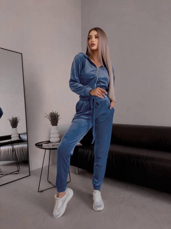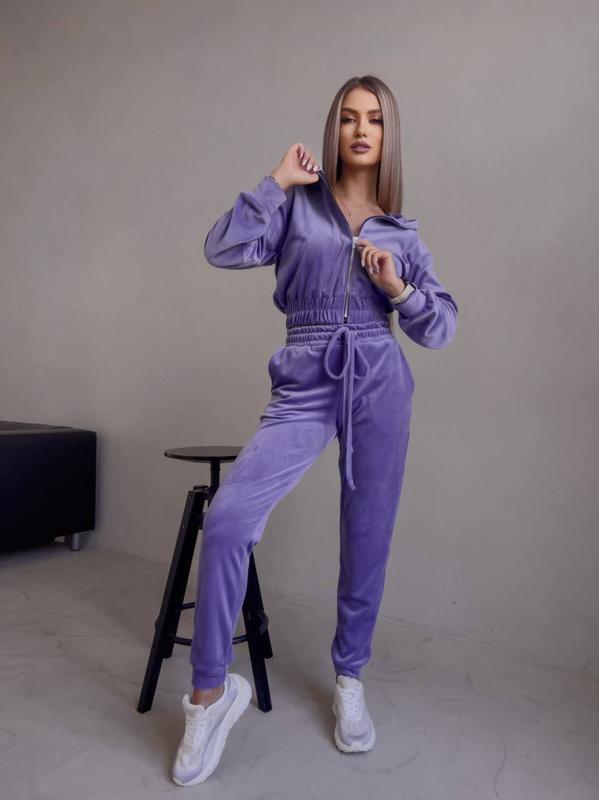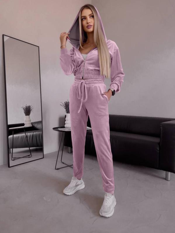 Дуже приємний та м‘який; кофта на декоративной змійці з капюшоном, низ на простроченій резинці; штани з кишенями, з манжетами, талія на простроченій резинці з зав‘язкою