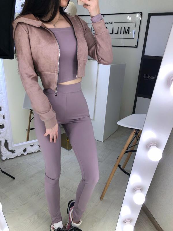 Костюм трійка "Must have" (топ, лосини, бомбер) Матеріал - (топ і лосини) щільний еластичний італійський джерсі, люкс якість! Ефект утяжки! Не кашлатится, практичний у використанні, дуже м'яка до тіла тканина❤; (бомбер) замш на дайвінг👍 Розмір єдиний з-му Кольори - чорний, капучіно, коричневий, пудра 1050грн (✔ 40 46 48 50 52 250грн), всім передплатникам знижка 10грн на кожній позиції, відправка товару по передоплаті 100 % протягом 3-5 робочих днів