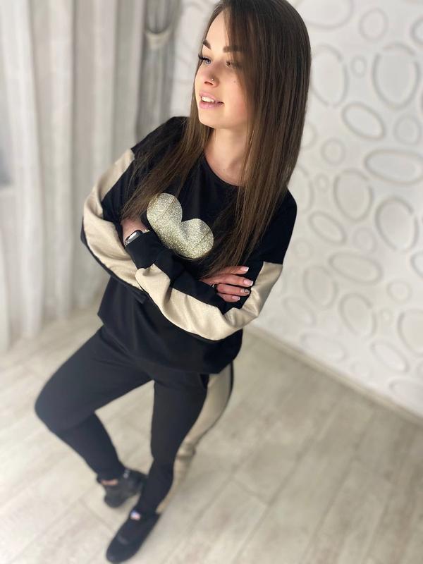 100%оплата По безпечній не відправляю ⭐️Стильний костюм "GOLDY" ✅Тканина : трикотаж двунітка ( якість 💥 бомба) ✨ Лампас: косюмка з блискучим напиленням 🌈Кольори: чорний, бежевий 🌟декор: якісний гліттер (не обсипається) 👭Розміри : 42-44 44-46 46-48 Неймовірно зручний і стильний ❤️